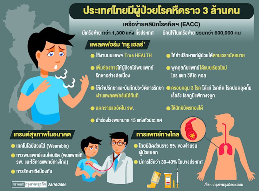 ดังนั้น จึงจำเป็นต้องนำเทคโนโลยีเข้ามาพัฒนาและปรับปรุงระบบการให้บริการ เครือข่ายคลินิกโรคหืดและปอดอุดกั้นเรื้อรังแบบง่าย (EACC) บริษัท แกล็กโซสมิทไคล์น (ประเทศไทย) จำกัด หรือ จีเอสเค และ กลุ่มทรู ผนึกกำลังเปิดโครงการ “Telehealth Together” คลินิกออนไลน์ เพื่อสุขภาพดี ร่วมพัฒนาระบบการแพทย์ ทางไกล หรือ Telemedicine ผ่านแพลตฟอร์มดูแลสุขภาพอัจฉริยะ “ทรู เฮลธ์” เพื่อเพิ่มโอกาสเข้าถึงการรักษาอย่างรวดเร็ว ทันท่วงที มีประสิทธิภาพและต่อเนื่อง โดยเฉพาะ ผู้ป่วยโรคระบบทางเดินหายใจ ครอบคลุม 3 โรค ได้แก่ โรคหืด โรคปอด อุดกั้นเรื้อรัง และโรคภูมิแพ้ทางจมูก ที่จำเป็นต้องได้รับการรักษาอย่างต่อเนื่อง แต่ไม่สามารถเดินทางไปโรงพยาบาลได้ในช่วงการแพร่ระบาดของโรคโควิด-19