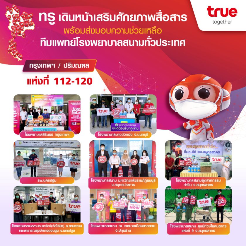 จากราชกิจจานุเบกษา ประกาศยกระดับ 13 จังหวัด เป็นพื้นที่ควบคุมสูงสุดและเข้มงวด กลุ่มทรู ภายใต้ “โครงการซีพี ร้อยเรียงใจ สู้ภัยโควิด-19” เดินหน้าอำนวยความสะดวกด้านการสื่อสารและส่งมอบความช่วยเหลืออย่างต่อเนื่อง เพิ่มอีก 9 แห่ง ได้แก่ โรงพยาบาลสิรินธร กรุงเทพมหานคร, โรงพยาบาลบางบัวทอง จังหวัดนนทบุรี, โรงพยาบาลสนามอุตสาหกรรม ท่าจีน จังหวัดสมุทรสาคร, โรงพยาบาลสนาม ศูนย์ห่วงใยคนสาคร แห่งที่ 9 อบต. ท่าทราย (วิท วอเตอร์ ซิสเต็ม ดีเวลลอปเม้น) จังหวัดสมุทรสาคร, โรงพยาบาลสนามมหาวิทยาลัยราชภัฎธนบุรี จังหวัดสมุทรปราการ, โรงพยาบาลนครปฐม, โรงพยาบาลเมตตาประชารักษ์(วัดไร่ขิง) อำเภอสามพราน จังหวัดนครปฐม, สาธารณสุขอำเภอดอนตูม จังหวัดนครปฐม และโรงพยาบาลสนาม เทศบาลเมืองลาดสวาย จังหวัดปทุมธานี ทั้งนี้ กลุ่มทรูได้ขยายเครือข่ายอัจฉริยะ True 5G และติดตั้ง True Gigatex Fiber เพื่อให้สามารถใช้สัญญาณได้ทั้ง 5G / 4G / WiFi ได้อย่างสะดวก ไม่สะดุด ตลอดจนมอบ True Super Talkie 4G พร้อมซิมทรูมูฟ เอชแบบเติมเงิน ให้บุคลากรทางการแพทย์ เพื่อใช้โทรและใช้งานดาต้าฟรี นาน 1 ปี นอกจากนี้ ยังเพิ่มความผ่อนคลายด้วยบริการ “ทรูวิชั่นส์ นาว” รับชม 24 ช่องดังจากทรูวิชั่นส์ได้ทันทีผ่านสมาร์ทโฟน บนแอปพลิเคชันทรูไอดี โดยมอบรหัสดูฟรีให้ผู้ป่วย ได้เพลิดเพลินกับสาระ ความบันเทิง และคอนเทนต์ ในรูปแบบสตรีมมิ่ง ตลอดช่วงกักตัว รวมถึงยังมอบน้ำดื่ม และหน้ากากอนามัย ซึ่งปัจจุบันรวมโรงพยาบาลที่ได้ส่งมอบความช่วยเหลือไปแล้วทั้งหมด 120 แห่ง ครอบคลุมในทุกพื้นที่ของประเทศไทย