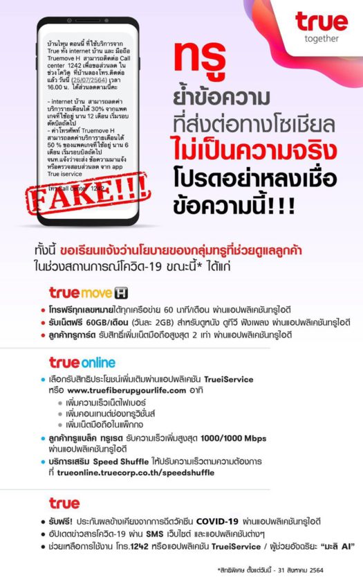 ทรู แจ้งลูกค้า อย่าหลงเชื่อข่าวปลอมที่มีการส่งต่อทางโซเชียล เรื่องผู้ใช้อินเทอร์เน็ตบ้านของทรูได้รับส่วนลด 30% และลูกค้าโทรศัพท์ทรูมูฟ เอช ได้รับส่วนลด 50% เพียงโทรไป 1242 บริษัท ฯ ขอย้ำว่า ข้อความดังกล่าวนั้น “ไม่เป็นความจริง” ทั้งนี้ ขอเรียนแจ้งว่า กลุ่มทรูมีนโยบายในการดูแลลูกค้าในช่วงสถานการณ์โควิด-19 ระหว่างวันที่ 30 กรกฎาคม – 31 สิงหาคม 2564 ดังนี้