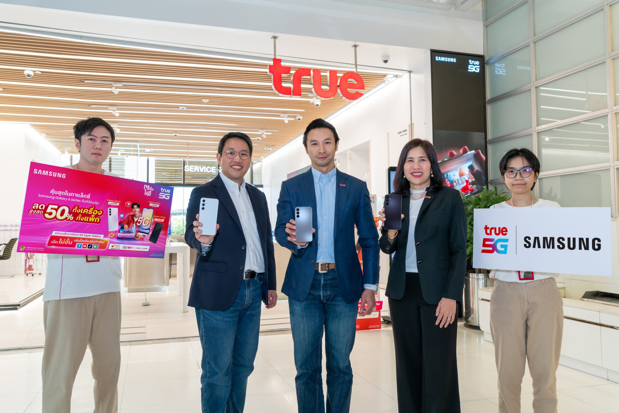 กรุงเทพฯ 23 พฤษภาคม 2567 – ปรากฎการณ์คุ้มที่สุดในกาแล็กซี่! …ทรู 5G โดย นายฐานพล มานะวุฒิเวช (กลาง) หัวหน้าคณะผู้บริหารด้านการตลาด และนางณัฏฐา พสุพัฒน์ (ที่ 2 จากขวา) หัวหน้าสายงานโมบายล์โพสต์เพย์ บมจ. ทรู คอร์ปอเรชั่น ร่วมกับ ซัมซุง โดย นายสิทธิโชค นพชินบุตร (ที่ 2 จากซ้าย) รองประธานองค์กร ธุรกิจโมบาย เอ็กซ์พีเรียนซ์ บริษัท ไทยซัมซุง อิเลคโทรนิคส์ จำกัด ยกขบวนกาแล็กซี่ จัดโปรโมชั่นคุ้มค่าสุดสุด Samsung Galaxy A Series ลดสูงสุด 50% ทั้งเครื่องทั้งแพ็กเกจ สมาร์ทโฟน 4G ลดค่าเครื่องสูงสุด 50% เริ่มต้นเพียง 1,099 บาท จากราคาปกติ 3,999 บาท และ สมาร์ทโฟน 5G ลดค่าเครื่องสูงสุด 50% เริ่มต้นเพียง 3,399 จากราคาปกติ 7,999 บาท พร้อมแพ็กเกจพิเศษ 5G Super Galaxy ลดสูงสุดถึง 50% จ่ายเพียง 849 จากปกติ 1,699 บาท เน็ต 5G ไม่อั้น เล่นโซเชียลไม่จำกัด เพื่อตอกย้ำความเป็นผู้นำ 5G ระดับโลก และประสบการณ์การใช้งานผ่านเครือข่าย 5G ผู้นำเครือข่ายอัจฉริยะของทรู 5G ที่เร็วแรงกว่า ครอบคลุมกว่า เพื่อคนไทยอย่างแท้จริง เฉพาะที่ทรู ดีแทคเท่านั้น นอกจากนี้ ยังช่วยอำนวยความสะดวกในการเป็นเจ้าของสมาร์โฟน Samsung Galaxy A Series ง่ายๆ ด้วยการผ่อนสบายไม่ใช้บัตรเครดิตจากบริการพิเศษ Pay Next Extra นานสูงสุด 48 เดือน สนใจเป็นเจ้าของกาแล็กซี่สุดคุ้ม ได้ที่ ทรูช็อป ดีแทคช็อป ทรูสเฟียร์ ทุกสาขา และเว็บไซด์ทรูสโตร์ ดีแทคออนไลน์สโตร์ ตั้งแต่วันนี้ – 30 มิถุนายน 2567 … Samsung Galaxy A Series ซื้อที่นี่มีแต่คุ้ม!