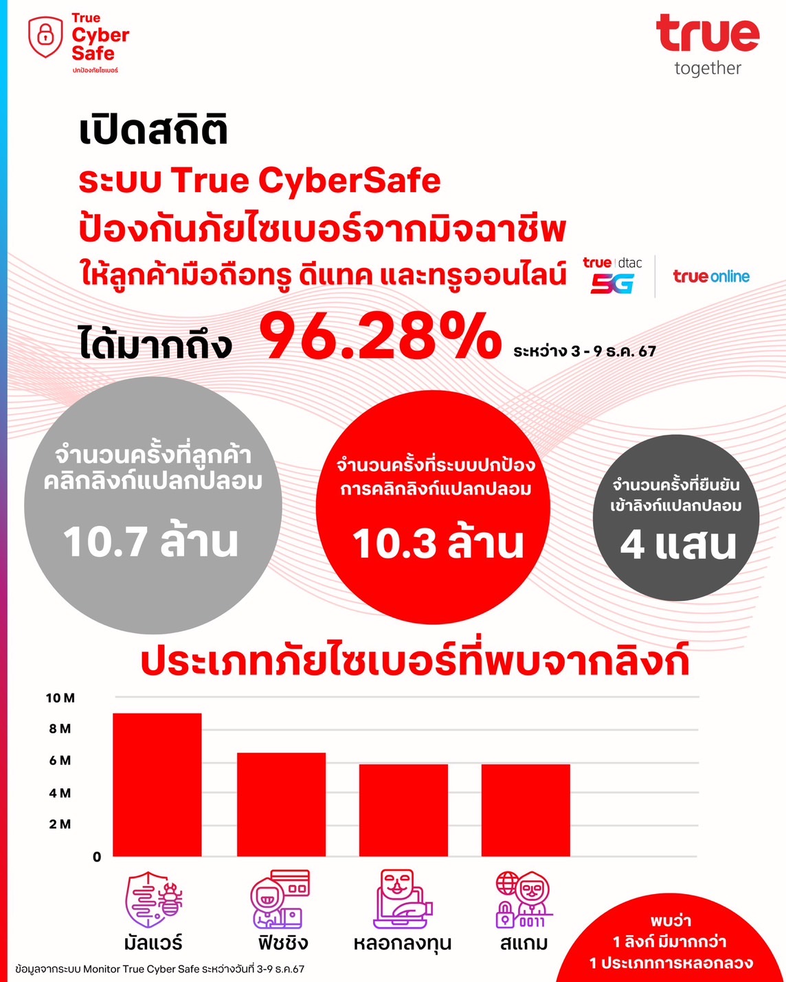 12 ธันวาคม 2567 : ภายหลังจากที่ ทรู คอร์ปอเรชั่น เดินหน้าภารกิจรักษาความปลอดภัยไซเบอร์ ลงทุนพัฒนาและนำ AI ขั้นสูงมาใช้เพื่อยกระดับการปกป้องและเพิ่มความปลอดภัยในการใช้บริการโลกออนไลน์ เปิดระบบป้องกันภัยไซเบอร์อัจฉริยะ “True CyberSafe” ให้บริการโดยไม่มีค่าใช้จ่ายสำหรับ ลูกค้ามือถือทรูและดีแทค รวมทั้งลูกค้าเน็ตบ้านทรูออนไลน์ ทุกราย โดยจะ บล็อก หรือ แจ้งเตือน เมื่อมีการเข้าถึงเว็บไซต์ที่อาจเป็นอันตราย หากลูกค้ากดเข้าไป จาก SMS หรือบราวเซอร์ และเมื่อมีการเข้าถึงเว็บไซต์ที่อาจเป็นอันตราย บนเว็บบราวเซอร์ โดยเริ่มให้บริการไปตั้งแต่วันที่ 3 ธันวาคมนั้น
