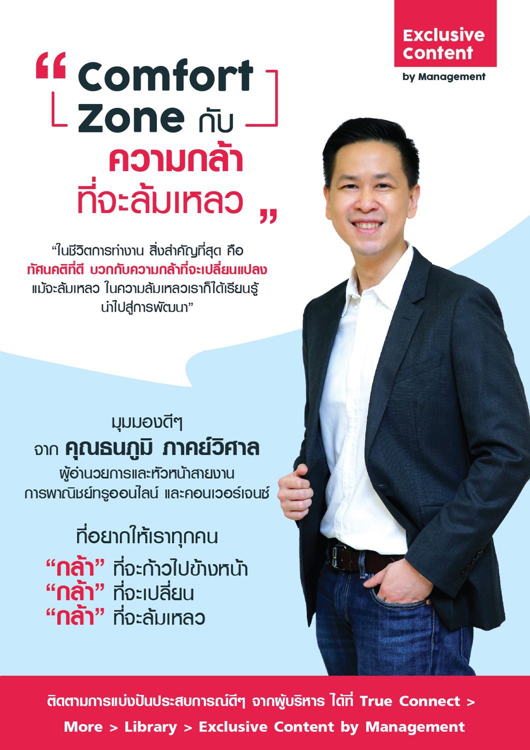 ก่อนหน้านี้ เวที Exclusive Content by Management ได้เชิญ คุณธนภูมิ ภาคย์วิศาล ผู้อำนวยการและหัวหน้าสายงานการพาณิชย์ทรูออนไลน์และคอนเวอร์เจนซ์ มาแชร์เรื่อง“Comfort Zone กับ ความกล้าที่จะล้มเหลว” ที่อยากให้เราทุกคน “กล้า” ที่จะก้าวไปข้างหน้า “กล้า” ที่จะเปลี่ยน และ “กล้า” ที่จะล้มเหลว