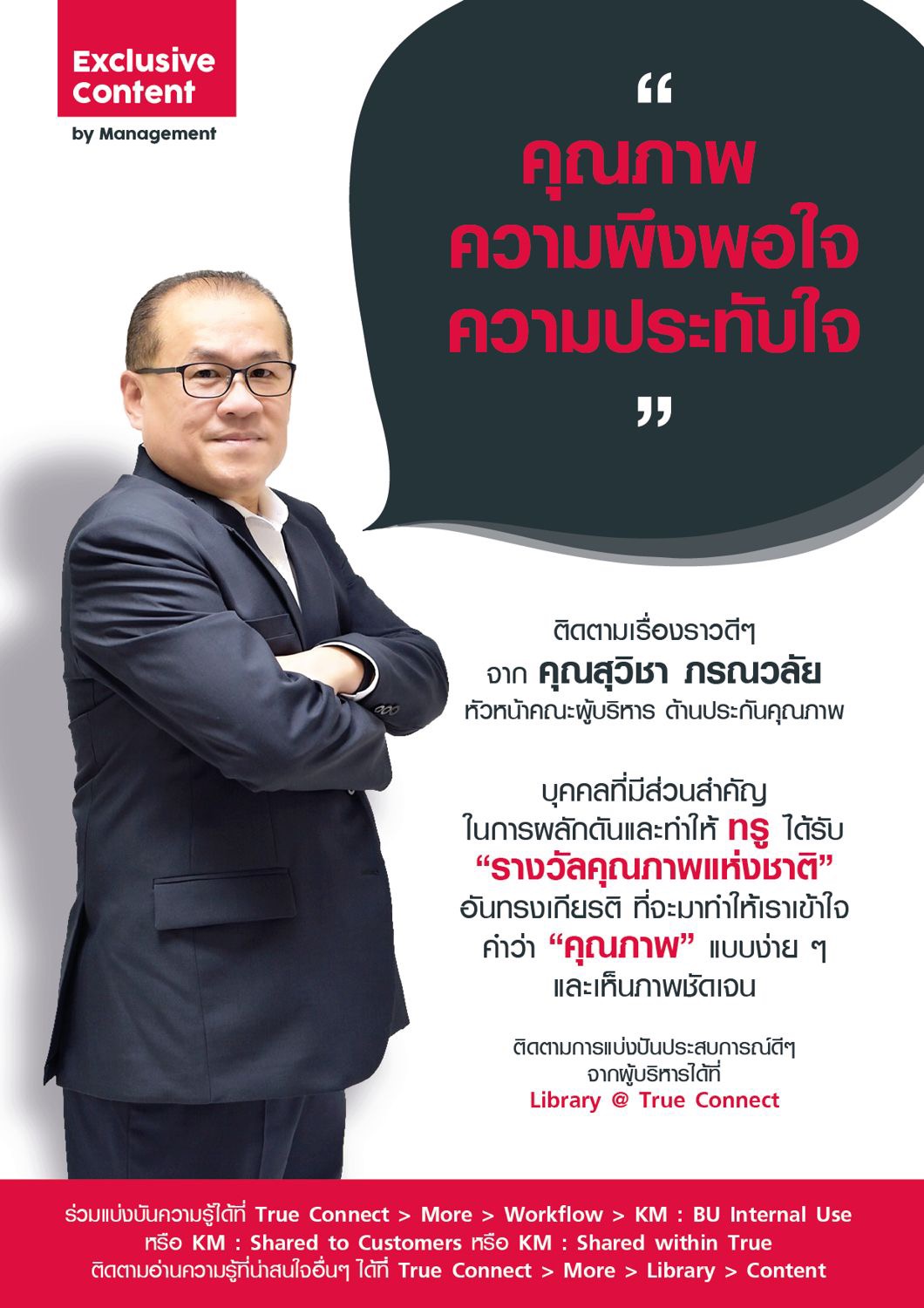 รวมทั้ง คุณสุวิชา ภรณวลัย หัวหน้าคณะผู้บริหาร ด้านประกันคุณภาพ บุคคล ที่มีส่วนสำคัญในการผลักดัน และทำให้ทรูได้รับ “รางวัลคุณภาพแห่งชาติ” อันทรงเกียรติ ที่จะมาทำให้เราเข้าใจคำว่า “คุณภาพ” แบบง่าย ๆ และเห็นภาพชัดเจน