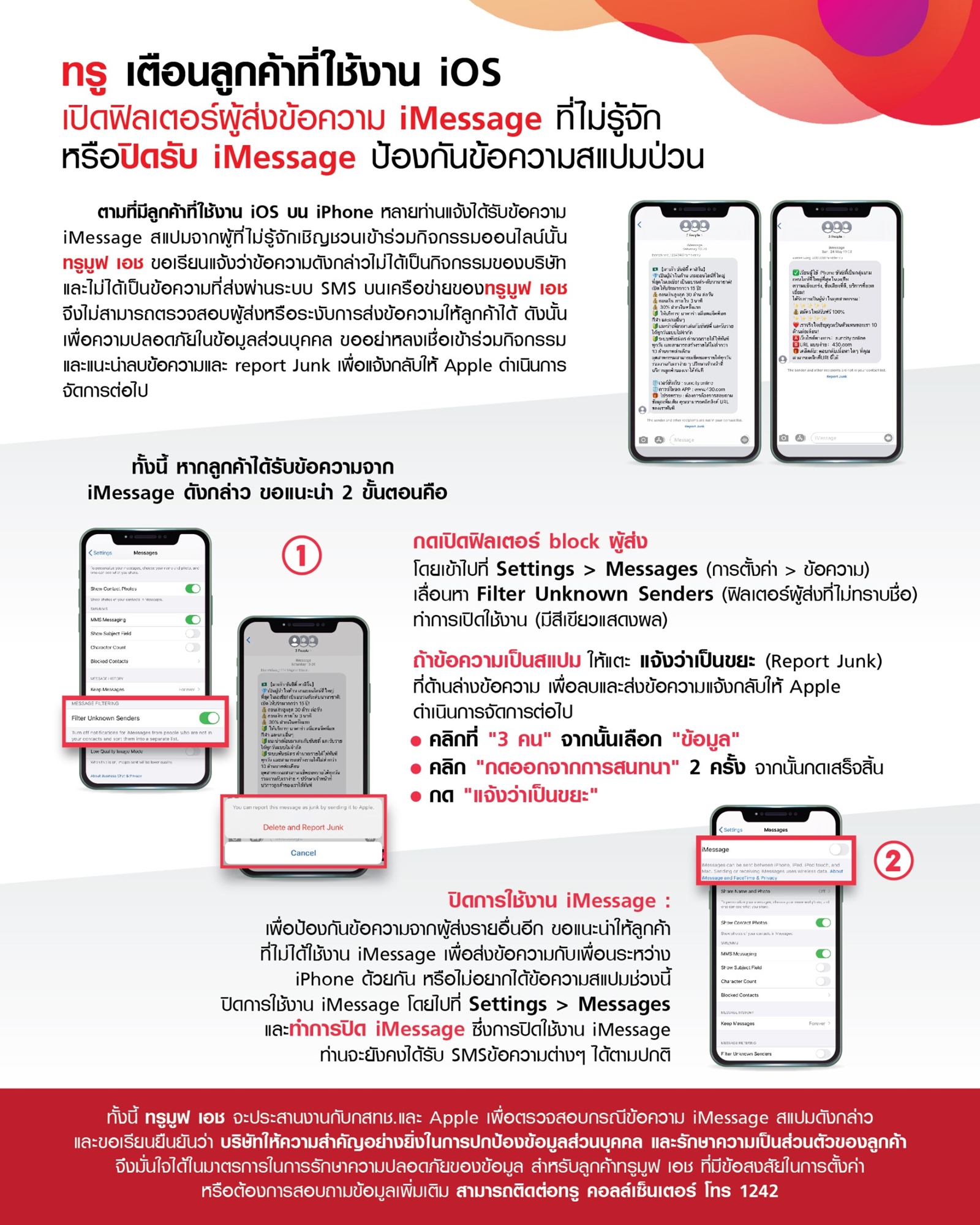 สำหรับการส่งข้อความผ่าน iMessage นั้น เป็นระบบการส่งข้อความของ Apple ผ่านการใช้งานดาต้าทั่วไป เมื่อลูกค้าเปิด WiFi หรือ มีการใช้งานดาต้าบนมือถือก็สามารถมีข้อความส่งเข้ามาได้ตลอดเวลา เช่นเดียวกับการส่งข้อความทางแอปพลิเคชันอื่นๆ จึงไม่สามารถที่จะเลือกระงับการส่งข้อความใดโดยเฉพาะได้ อย่างไรก็ตาม บริษัทฯ ไม่ได้นิ่งนอนใจ ได้ประสานไปยังกสทช. และ Apple เพื่อที่จะร่วมกันตรวจสอบต้นทางในการส่งข้อความที่สร้างความรำคาญใจและเป็นกังวลกับผู้ใช้งาน ทั้งนี้ หากลูกค้าได้รับข้อความจาก imessage ดังกล่าว ขอแนะนำ 2 ขั้นตอนคือ