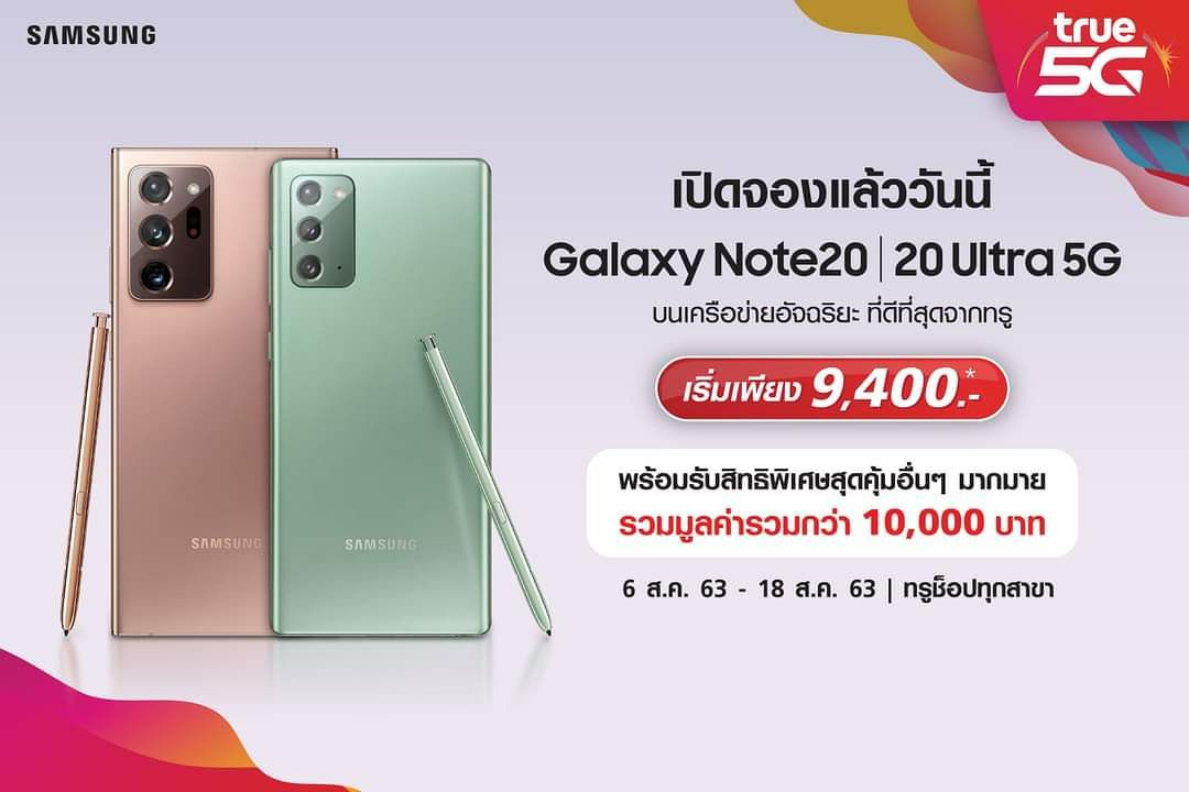ทรูมูฟ เอช เอาใจสาวกซัมซุง เปิดจอง Samsung Galaxy Note 20|Note20 Ultra แล้ววันนี้ พร้อมสัมผัสสุดยอดประสิทธิภาพการใช้งานไม่มีสะดุด จากการผสานระหว่างเครือข่าย อัจฉริยะทรู 5G และดีไวซ์ 5G สุดล้ำจากซัมซุง ในราคาเริ่มต้นเพียง 9,400 บาท สำหรับลูกค้าทรูแบล็ค ส่วนลูกค้าทั่วไปเริ่มต้นเพียง 13,900 บาท เมื่อใช้คะแนนทรูพอยท์ 5,000 คะแนน พิเศษ! ลูกค้าย้ายค่ายเบอร์เดิม รับส่วนลดเพิ่มสูงสุด 2,000 บาท และเพิ่มความคุ้มค่ายิ่งขึ้นเมื่อนำเครื่องเก่ามาแลกซื้อ Samsung Galaxy Note 20 l Note 20 Ultra ลดอีกทันที 3,000 บาท พร้อมรับโปรโมชั่นสุดเอ็กซ์คลูซีฟจัดเต็มถึง 10 ต่อ อาทิ สิทธิประโยชน์ระดับทรูแบล็ค นาน 1 ปี, รับฟรี Google Nest และ Samsung Clear view cover case, ดูฟรี! ทรูพรีเมียร์ลีกฤดูกาล 2020/21 นาน 10 เดือน ผ่านแอพ TrueID, บริการ True Protech ฟรี 6 เดือน เปลี่ยนมือถือทันใจ มีเครื่องใช้ทันที, ฟรีเน็ตไม่อั้น 12 เดือน สำหรับชม Netfilx และสิทธิพิเศษอื่นอีกมากมาย รวมมูลค่าแถมฟรีกว่า 10,000 บาท เป็นเจ้าของสมาร์ทโฟนสุดล้ำได้ก่อนใคร ตั้งแต่วันที่ 6 – 18 สิงหาคม 2563 ที่ www.truemoveh.com/galaxynote20/preorder ทรูช็อปทุกสาขา, เว็บ True Store, Line @True Store และรับเครื่องได้ในวันที่ 19 – 22 สิงหาคม 2563 ที่ทรูช็อป สาขาที่เลือกไว้