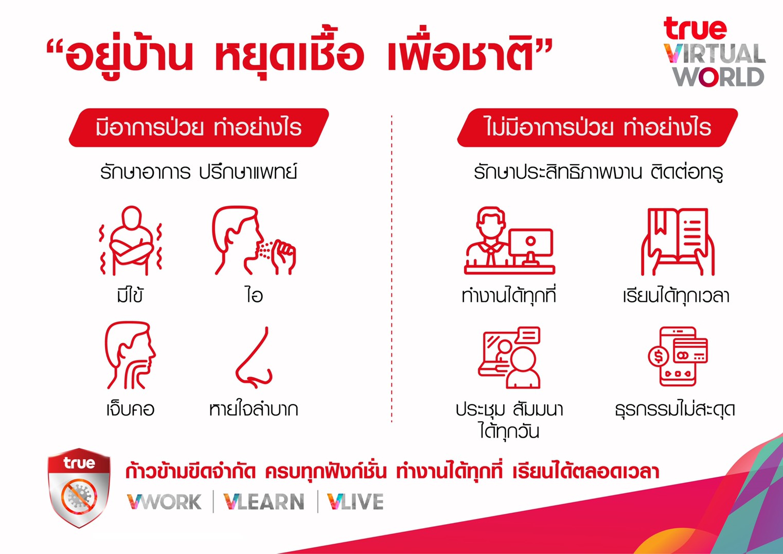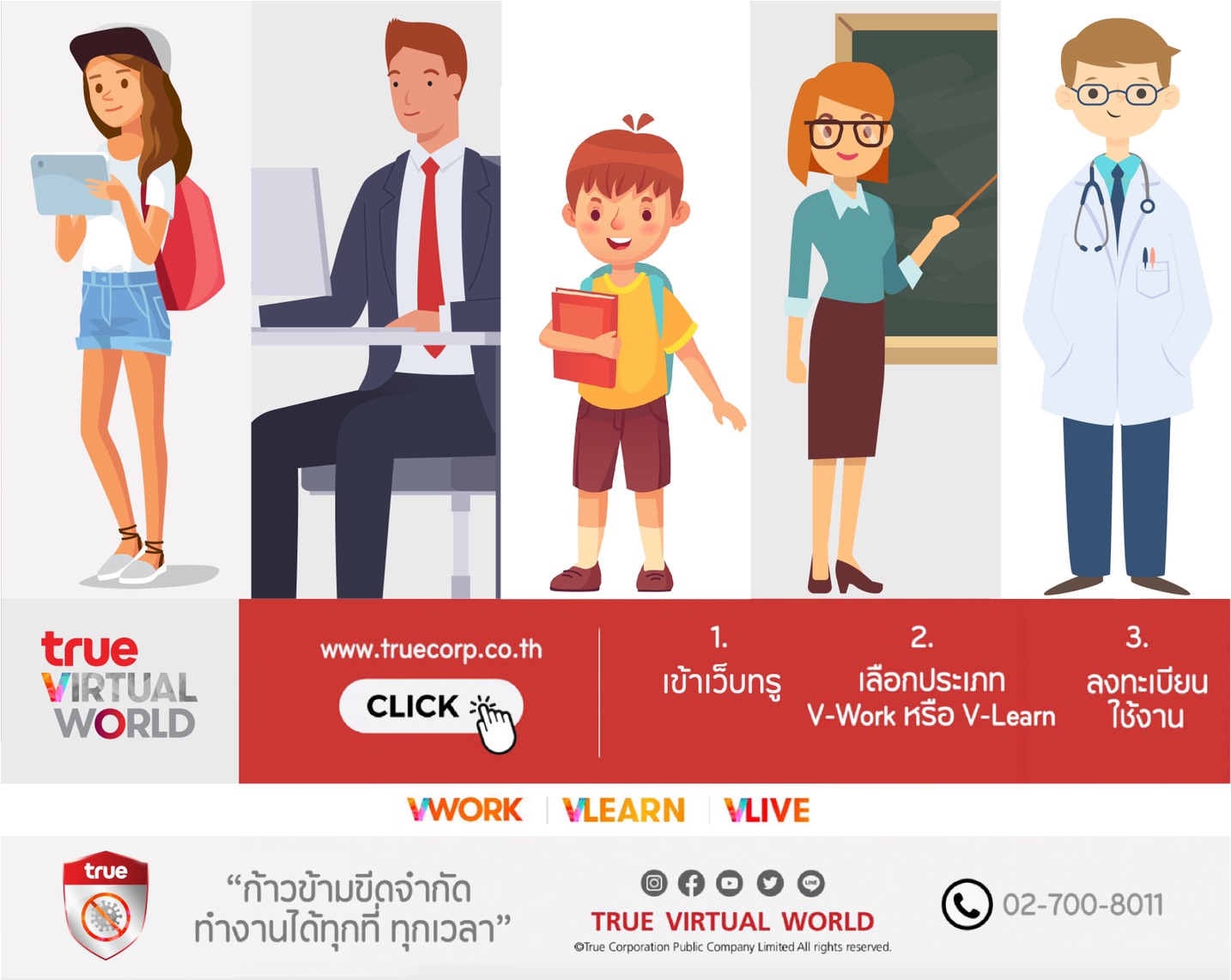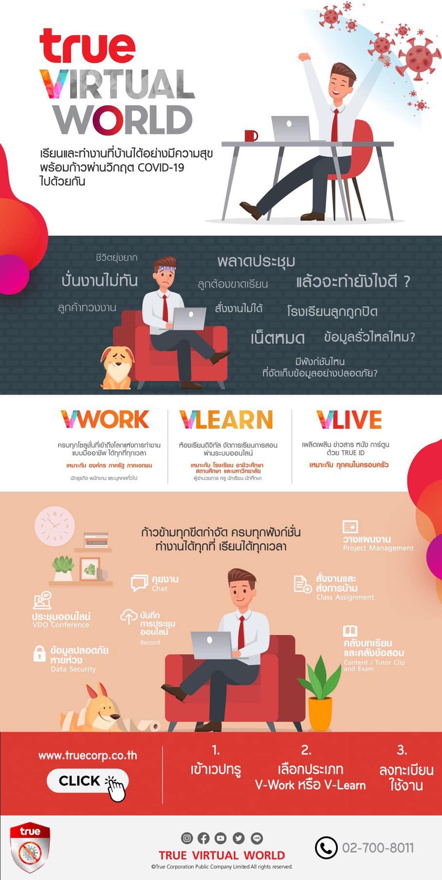 “True Virtual World” ผู้ช่วยบนโลกดิจิตอลทางออกเชื่อมโลกออนไลน์ ง่ายๆเพื่อคุณเพราะทุกคนคือคนสำคัญ กลุ่มทรูจึงมุ่งมั่นให้คนไทยสามารถติดต่อสื่อสารใช้ชีวิตข้ามผ่านวิกฤติ COVID-19 อย่างราบรื่นไปด้วยกัน ด้วย “True Virtual World”ที่เราได้สร้างสรรค์ขึ้น เพื่อให้นักเรียนทุกคนสามารถเรียนรู้แบบออนไลน์ให้ธุรกิจสามารถเติบโตต่อไปได้ และเพิ่มประสบการณ์ดีๆ ร่วมกันในครอบครัว