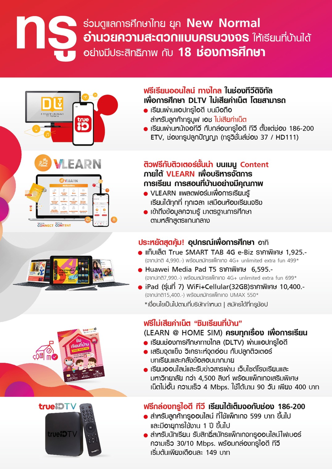 กลุ่มทรู ผู้นำดิจิทัลไลฟ์สไตล์ครบวงจร พร้อมนำศักยภาพด้านเทคโนโลยีสื่อสารร่วมสนับสนุนการศึกษาไทยต่อเนื่องในยุคนิว นอร์มัลเพิ่มโอกาสเข้าถึงแหล่งความรู้ และลดความเหลื่อมล้ำให้เยาวชนทั่วประเทศ ได้เรียนรู้อย่างเท่าเทียม อำนวยความสะดวกให้เรียนที่บ้านแบบครบวงจร ไม่สะดุด มีประสิทธิภาพ และประหยัดค่าใช้จ่าย