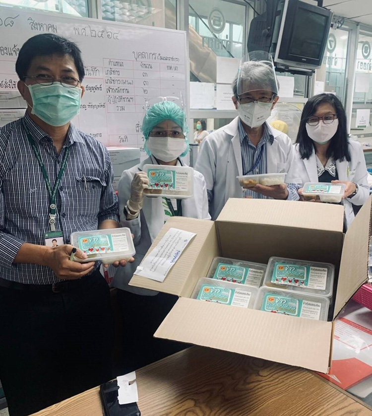 แม้โครงการครัวปันอิ่ม จะมีเป้าหมายช่วยเหลือพี่น้องในชุมชน แต่ก็ไม่ละเลยที่จะแบ่งปันความอิ่มแทนคำขอบคุณไปยังกลุ่มแพทย์ พยาบาล และบุคลากรสาธารณสุข ซึ่งเป็นด่านหน้าสำคัญอย่างยิ่งที่ต่างเสียสละ ทุ่มเทกำลังกายอย่างไม่เหน็ดเหนื่อย เพื่อยับยั้งการแพร่ระบาดและรักษาผู้ป่วยโควิด-19 ให้หายเป็นปกติ โดยในแต่ละจุด กลุ่มทรู ได้ดูแลส่งมอบข้าวกล่อง หน้ากากอนามัยซีพี และกาแฟทรูคอฟฟี่คัพ แก่กลุ่มแพทย์พยาบาลที่ประจำการตามศูนย์ต่าง ๆ