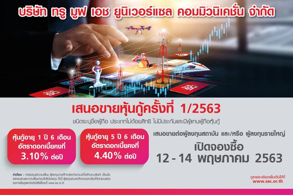 กลุ่มทรู โดย บริษัท ทรู มูฟ เอช ยูนิเวอร์แซล คอมมิวนิเคชั่น จำกัด หรือ TUC ได้รับอนุมัติการออกและจำหน่ายหุ้นกู้ TUC ครั้งที่ 1/2563 ประเภทไม่ด้อยสิทธิ ไม่มีประกัน และมีผู้แทนผู้ถือหุ้นกู้ อายุ 1 ปี 6 เดือน อัตราดอกเบี้ยคงที่ 3.10% ต่อปี และ อายุ 5 ปี 6 เดือน อัตราดอกเบี้ยคงที่ 4.40% ต่อปี เสนอขายให้ผู้ลงทุนสถาบันและ/หรือผู้ลงทุนรายใหญ่ ระหว่างวันที่ 12-14 พฤษภาคม 2563 โดยบริษัทฯ และ หุ้นกู้ ได้รับการจัดอันดับความน่าเชื่อถือที่ระดับ BBB+ และแนวโน้มเครดิต “คงที่” จากบริษัท ทริสเรทติ้ง จำกัด เมื่อวันที่ 5 พฤษภาคม 2563 พร้อมแต่งตั้งธนาคารกรุงเทพ ธนาคารกสิกรไทย ธนาคารไทยพาณิชย์ ธนาคารซีไอเอ็มบี ไทย และธนาคารธนชาต เป็นผู้จัดการการจัดจำหน่ายหุ้นกู้ โดยมีธนาคารกรุงศรีอยุธยา เป็นผู้แทนผู้ถือหุ้นกู้