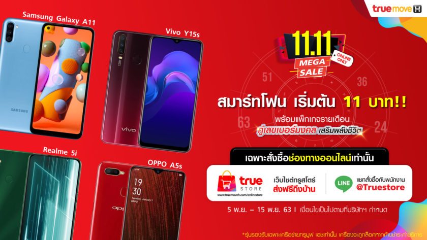 1 ปีมีครั้งเดียว กับเทศกาล 11.11 ซึ่งตรงกับวันที่ 11 พฤศจิกายนของทุกปี TrueStore ประเดิมปีแรกการันตีความคุ้ม ลดแรงที่สุดในรอบปี!!.. จัดหนักให้ลูกค้าทรูพิเศษกว่าใคร สมาร์ทโฟนพร้อมเบอร์มงคลแบบรายเดือน เสริมพลังชีวิต เริ่มต้นเพียง 11 บาท เฉพาะ 4 รุ่นฮิตเท่านั้น (รุ่นรองรับเฉพาะเครือข่ายทรูมูฟ เอช เท่านั้น)