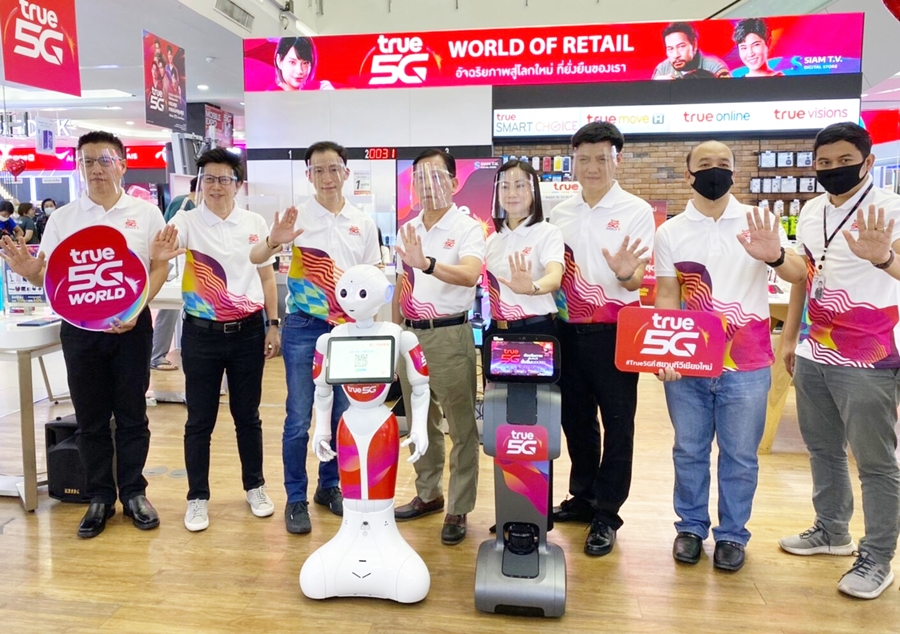 กลุ่มทรู โดย คุณธวัชชัย ฤกษ์สำราญ(ที่ 3 จากซ้าย) รองผู้อำนวยการธุรกิจ โมบายและคณะกรรมการยุทธศาสตร์5G บมจ.ทรู คอร์ปอเรชั่น และคุณจินดาภรณ์ มะโนวรรณา (ที่ 2 จากซ้าย) ผู้จัดการทั่วไปเขตภาคเหนือตอนบน จับมือ บริษัท เชียงใหม่สยามทีวี จำกัด โดย ดร.พิทักษ์ ปลื้มพิทักษ์กุล (ที่5 จากขวา) กรรมการผู้จัดการ เชิญชวนชาวเชียงใหม่และชาวเหนือ สัมผัสนวัตกรรมทรู 5G อัจฉริยภาพสู่โลกใหม่ที่ยั่งยืนของเรา พบกับ 5G Robot “5G Pepper Greeting Bot” หุ่นยนต์ต้อนรับอัจฉริยะ ที่พร้อมให้ความรู้และความบันเทิง แก่ผู้เข้าชมงาน และ “True 5G Temi Connect & CareBot” หุ่นยนต์สื่อสารอัจฉริยะ ที่มีทั้งฟังก์ชั่นการสื่อสาร และสามารถส่งของได้