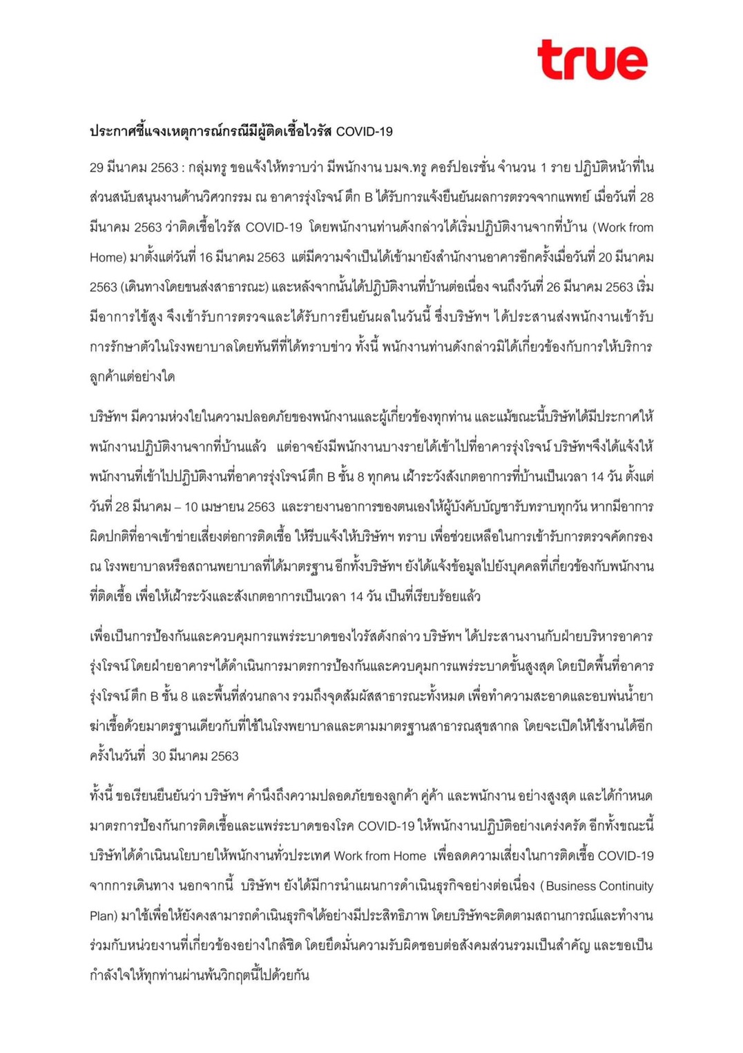 ทรูประกาศชี้แจงพบพนักงาน 1 ราย ที่ปฏิบัติงานในอาคารรุ่งโรจน์ ตึกB ติดโควิด-19 พร้อมดำเนินการส่งพนักงานรับการรักษาและแจ้งพนักงานที่ใกล้ชิดเฝ้าระวังและดำเนินการทำความสะอาดป้องกันการแพร่ระบาดสูงสุด รวมทั้งให้พนักงานดำเนินมาตรการ Work from Home และให้การบริการลูกค้าต่อเนื่องต่อไป