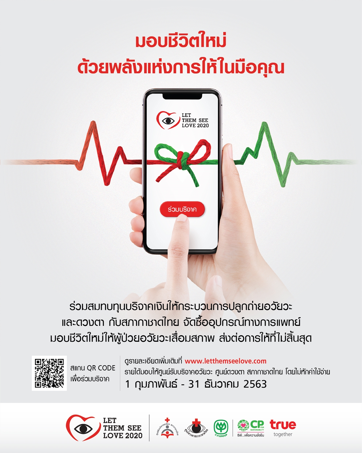 ทำความดีครั้งใหญ่ ไม่ต้องรอโอกาสพิเศษ…ร่วมสมทบทุน โครงการ Let Them See Love ร่วมบริจาคเงินสมทบทุนค่าใช้จ่ายเพื่อจัดซื้ออุปกรณ์ทางการแพทย์ และค่าใช้จ่ายในกระบวนการปลูกถ่ายอวัยวะและดวงตา สภากาชาดไทย มอบชีวิตใหม่ให้ผู้ป่วยอวัยวะเสื่อมสภาพ ส่งต่อการให้ไม่สิ้นสุด