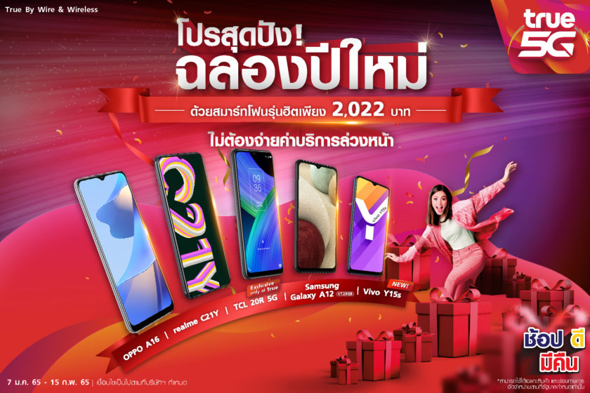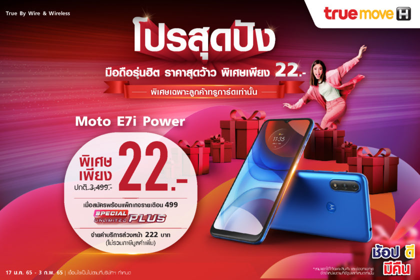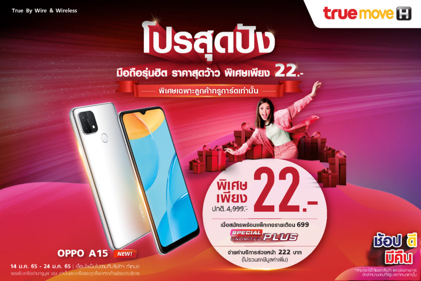 นอกจากนี้ทรูยังได้จัดเตรียมความพิเศษเพื่อมาร่วมเป็นครอบครัวทรู พร้อมสัมผัสประสบการณ์เครือข่ายอัจฉริยะทรู 5G ด้วยกัน กับโปรสุดปัง…เป็นเจ้าของสมาร์ทโฟน OPPO A15 New ในราคาดีที่สุดที่เดียว เพียง 22 บาท (ปกติ 4,999 บาท) เอ็กซ์คลูซีฟเฉพาะลูกค้าทรูการ์ดเท่านั้น! เมื่อซื้อเครื่องพร้อมแพ็กเกจ Special Unlimited Plus 699 และชำระค่าบริการล่วงหน้า 222 บาท ตั้งแต่วันนี้ถึง 24 มกราคม 65 และ Moto E7i Power (ปกติ 3,499 บาท) เมื่อซื้อเครื่องพร้อมสมัครแพ็กเกจ Special Unlimited Plus 499 และชำระค่าบริการล่วงหน้า 222 บาท ตั้งแต่วันนี้ถึง 3 กุมภาพันธ์ 65 พร้อมพบกับสมาร์ทโฟน 5G และ 4G อีกหลากหลายรุ่นยอดฮิต ฉลองต้อนรับปี 2022 ในราคาโดนใจเพียง 2022 บาท ได้แก่ TCL 20R 5G (ปกติ 6,990 บาท), Samsung Galaxy A12 (ปกติ 5,299 บาท), OPPO A16 (ปกติ 5,990 บาท), realme C21Y (ปกติ 4,990 บาท) ,Vivo Y15s (ปกติ 4,990 บาท) เมื่อสมัครแพ็กเกจ Special Unlimited Plus เริ่มต้นเพียงเดือนละ 499 บาท (ตามเงื่อนไขที่กำหนด) และไม่ต้องชำระค่าบริการล่วงหน้า ตั้งแต่วันนี้ถึง 15 กุมภาพันธ์ 65 พร้อมรับสิทธิพิเศษเน็ตไม่อั้น ดูฟรี! ทรูพรีเมียร์ลีก ผ่านแอป TrueID และผ่อน 0% นานสูงสุด 48 เดือนผ่านบัตรเครดิตที่ร่วมรายการ พลาดไม่ได้…กับข้อเสนอสุดคุ้มทั้งหมดนี้ที่ทรูช็อป ทุกสาขา ทรูช็อปใน 7-Eleven โลตัส และแม็คโคร สั่งซื้อออนไลน์ผ่านเว็บทรูสโตร์ หรือ Line@ True Store, Facebook Inbox Chat : TrueMove H Call & Shop 02-700-8000