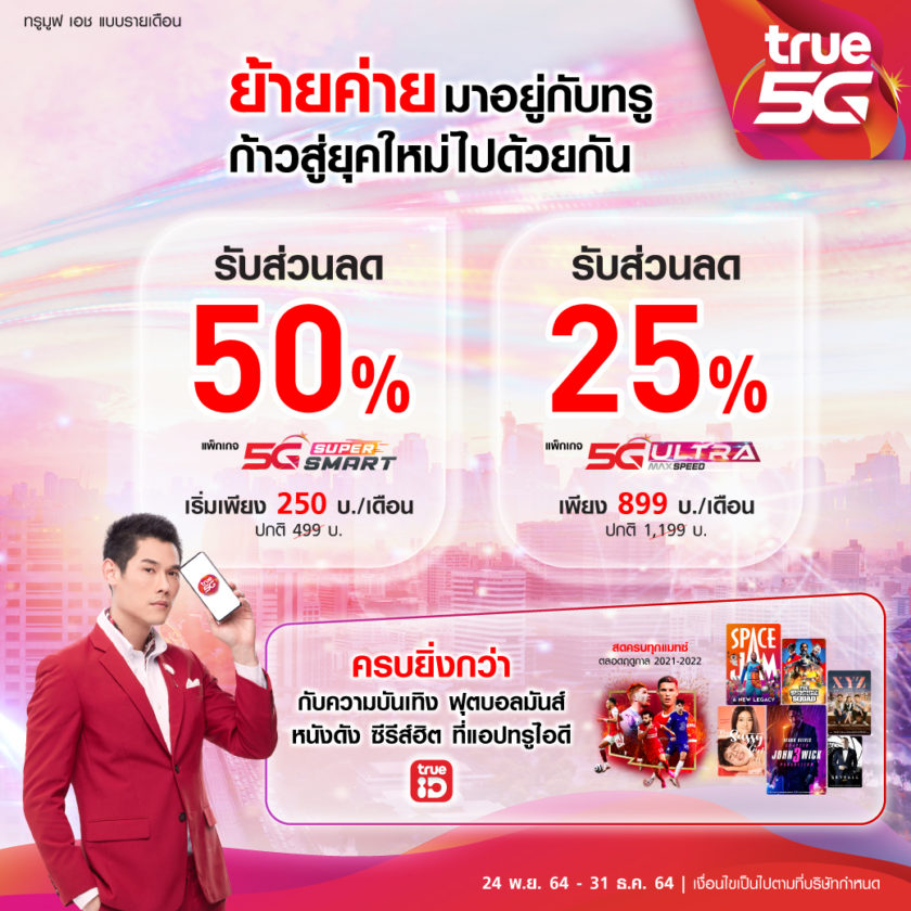 กรุงเทพฯ 29 พฤศจิกายน 2564– อยู่กับทรู ก้าวสู่ยุคใหม่ไปด้วยกัน….ตอกย้ำความสำเร็จโปรโมชั่นย้ายค่ายมาเป็นรายเดือนที่มอบความคุ้มค่าแบบสุดจริงจัดหนัก บนเครือข่ายอัจฉริยะทรู 5G ที่เร็วกว่า แรงกว่า รายแรก รายเดียวครบสุดทุกย่านความถี่ กับแพ็กเกจสุดคุ้ม ราคาประหยัดเริ่มต้นเพียง 250 บาท พร้อม ชู 2 แพ็กเกจโดนใจที่ได้รับการตอบรับจากลูกค้าอย่างต่อเนื่อง ได้แก่ แพ็กเกจ 5G Super Smart ลด 50% เพียง 450 บาท/เดือน (ปกติ 899 บาท) พร้อมใช้ฟรี 1 เดือน เน็ตเต็มสปีด 35 GB และโทรทุกเครือข่าย 400 นาที และแพ็กเกจ 5G Ultra Max Speed รับส่วนลด 25% นาน 12 เดือน เริ่มต้นเพียง 899 บาท (ปกติ 1,199 บาท) เน็ต 5G เต็มสปีด ไม่จำกัด พร้อมโทรเบอร์ทรูฟรี 24 ชม. นอกจากนี้ลูกค้าที่ย้ายค่ายยังจะได้รับสิทธิพิเศษอีกมากมาย อาทิ ดูฟรี! ทรูพรีเมียร์ลีก สด ครบทุกแมตช์ และ ดูหนัง ดูซีรีส์ดัง ไม่เสียค่าเน็ต ผ่านแอปทรูไอดี สมัครได้เลยตั้งแต่วันนี้ – 31 ธันวาคม 2564 ลูกค้าสามารถย้ายค่ายผ่านออนไลน์ได้ทุกที่ ทุกเวลา สะดวก ใช้เวลาเพียง 2 วันทำการเท่านั้น ดูรายละเอียดเพิ่มเติมเกี่ยวกับโปรย้ายค่ายคุ้มสุดจริงและวิธีการย้ายค่ายได้https://store.truecorp.co.th/เมนูย้ายค่ายเบอร์เดิม