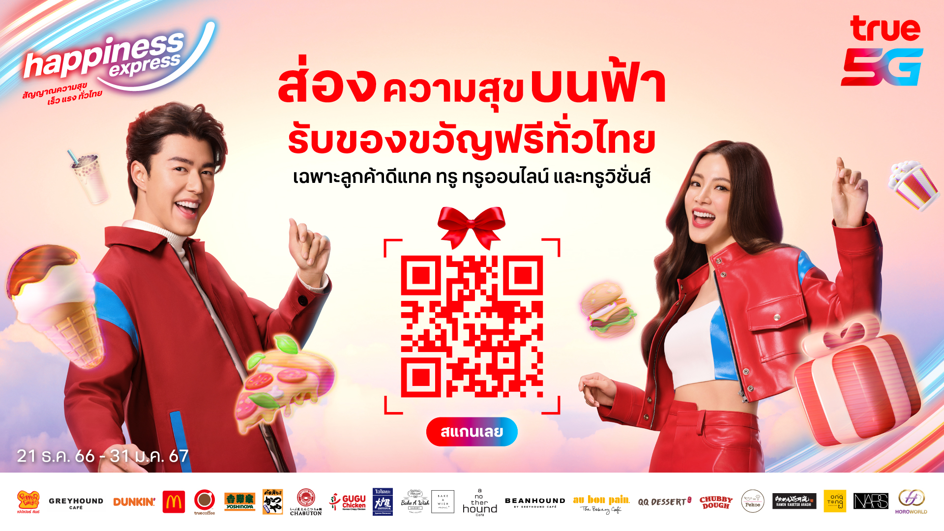 - Happiness Gift : All dtac and True 5G customers, totaling over 9 million numbers, receive an additional special gift from 10 more brands, such as: Greyhound Cafe, Another hound cafe, BEANHOUND, au bon pain, NARS, Chabuton, Pepper Lunch, Yoshinoya, TrueCoffee, and McDonald’s total 21