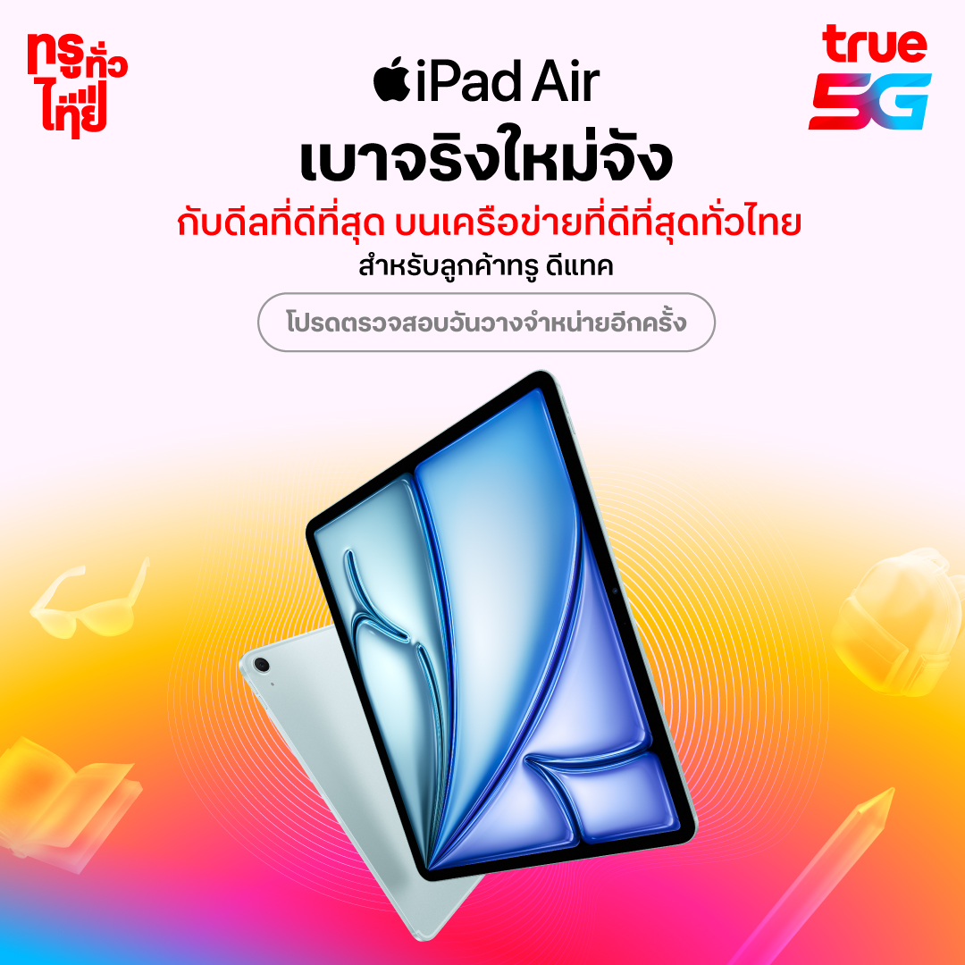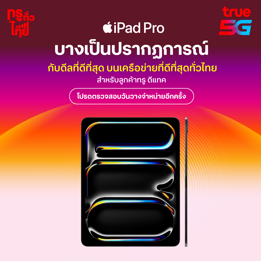 Bangkok, May 10th, 2024 – True 5G will offer the new iPad Pro in a stunning, thin and light design, with a breakthrough Ultra Retina XDR display, and outrageously fast M4 chip with powerful AI capabilities; in addition to the redesigned 11-inch and all-new 13-inch iPad Air, supercharged by the M2 chip delivering phenomenal performance and advanced capabilities. Customers may check back later for availability. For more information, please visit https://www.true.th/apple/ipad-pro-m4/index.html and iPad Air at https://www.true.th/apple/ipad-air-m2/index.html