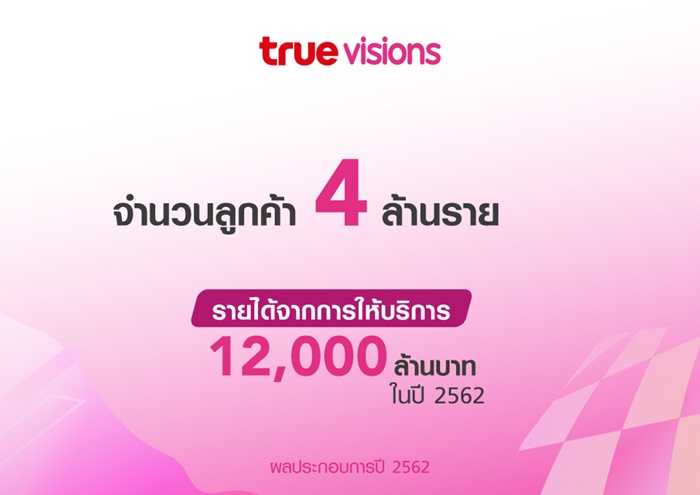 ส่วนทรูวิชั่นส์ มุ่งนำเสนอคอนเทนต์คุณภาพชั้นนำและเอ็กซ์คลูซีฟหลากหลาย โดยเฉพาะลิขสิทธิ์การถ่ายทอดสดฟุตบอลพรีเมียร์ลีก อังกฤษ ช่วยสร้างมูลค่าเพิ่มให้กับแพลตฟอร์มและบริการอื่น ๆ ของกลุ่มทรู พร้อมตอบโจทย์พฤติกรรมของผู้บริโภคที่เปลี่ยนไปใช้งานผ่านช่องทางออนดีมานด์ ช่องทางออนไลน์และช่องทางดิจิทัลมากขึ้น ทั้งนี้ ในปี 2562 ทรูวิชั่นส์มีฐานลูกค้ารวมประมาณ 4 ล้านรายและมีรายได้จากการให้บริการอยู่ที่ 1.2 หมื่นล้านบาท