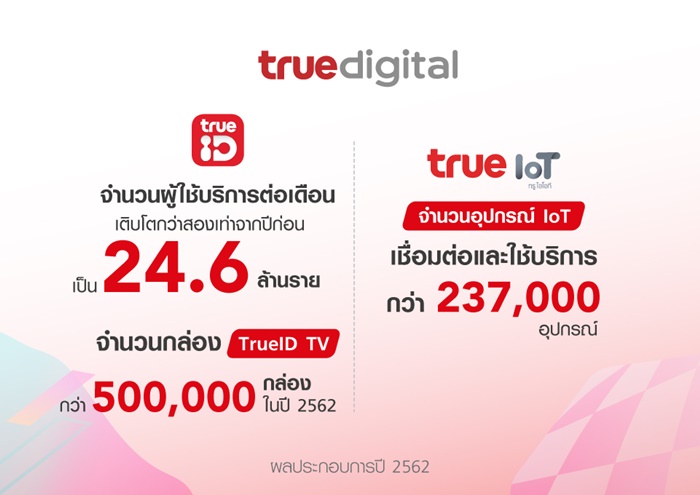 สุดท้ายทรู ดิจิทัล กรุ๊ป ที่นับเป็นจุดแข็งและสร้างความแตกต่างให้กับกลุ่มทรู โดยแพลตฟอร์มดิจิทัลอย่าง TrueID ได้รับการตอบรับอย่างสูงและมีฐานผู้ใช้บริการต่อเดือนที่เติบโตกว่าสองเท่าจากปีก่อนเป็น 24.6 ล้านราย ทั้งนี้ จำนวนการสมัครดูคอนเทนต์ทรูไอดีเติบโตแข็งแกร่งกว่า 56% จากไตรมาสก่อน
