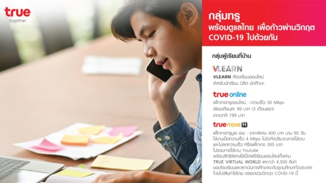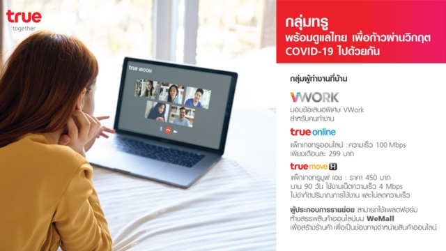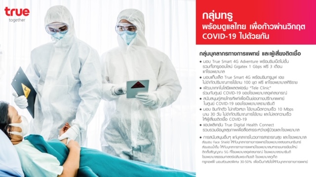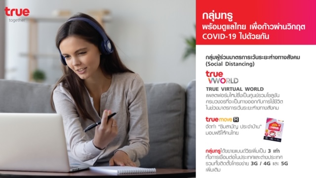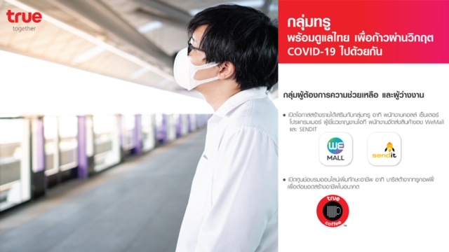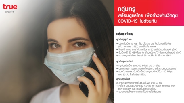 รายงานข่าวจากกลุ่มทรูเปิดเผยว่า บริษัทได้นำพลังจากทุกกลุ่มธุรกิจ ทั้งด้านโครงสร้างพื้นฐานโทรคมนาคม ดิจิทัลเทคโนโลยี แพลตฟอร์ม และโซลูชัน คอนเทนต์ สิทธิพิเศษ และสื่อในเครือร่วมหาทางออกฝ่าวิกฤต และส่งมาตรการช่วยเหลือลูกค้าและประชาชนชาวไทยในหลายรูปแบบ มีเป้าหมายเพื่อให้สังคมไทยก้าวข้ามผ่านวิกฤต COVID-19 นี้ไปด้วยกัน