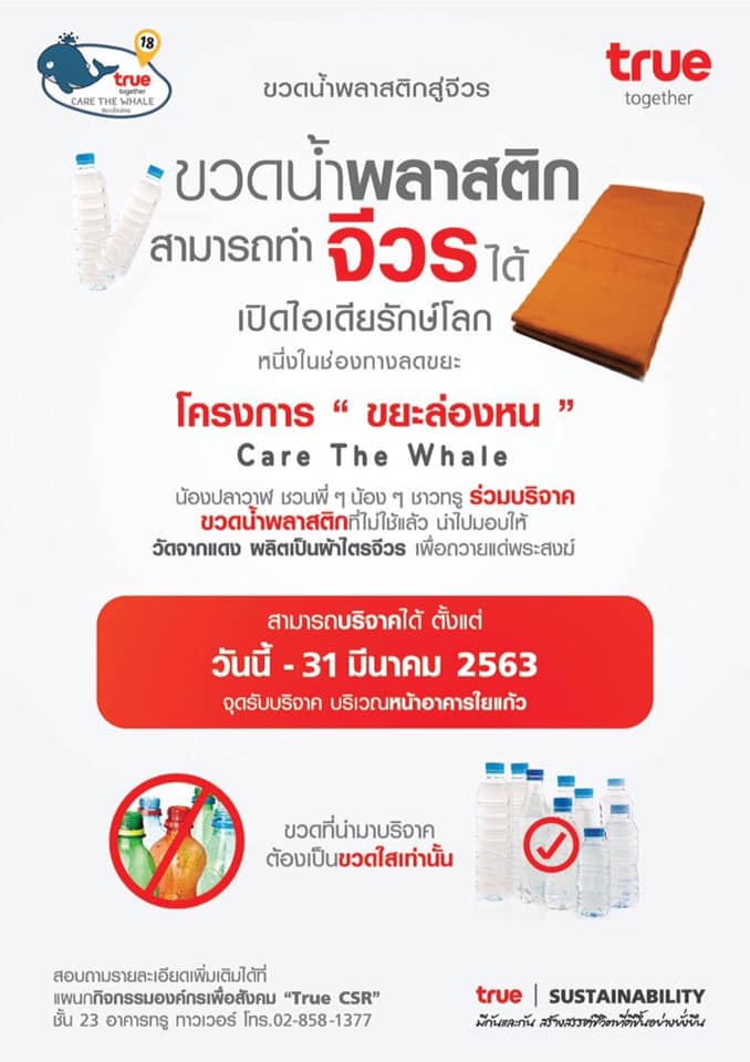 บริจาคได้ที่จุดรับบริจาคหน้าอาคารใยแก้ว อาคารทรู ทาวเวอร์ ได้ตั้งแต่วันนี้ – 31 มีนาคม 2563 (ขวดที่นำมาบริจาค ต้องเป็นขวดใสเท่านั้น)