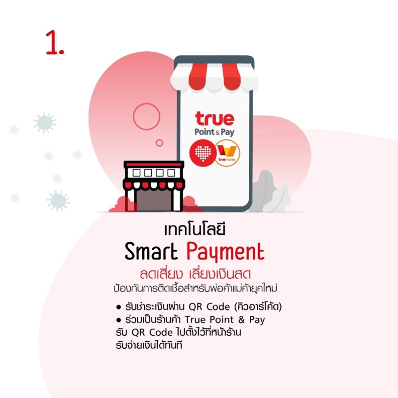 1.เทคโนโลยี Smart Payment ผ่าน QR Code (คิวอาร์โค้ด) ระบบชำระเงินรูปแบบใหม่ ไม่ต้องง้อเงินสด หลีกเลี่ยงการสัมผัส จับต้องเงินสด เพราะพ่อค้าแม่ค้ายุคใหม่สามารถสมัครเข้าร่วมเป็นร้านค้า True Point & Pay วันเดียวรู้ผล ได้รับอนุมัติปั๊บ ปรินท์ป้าย True Point & Pay พร้อม QR Code ไปตั้งไว้ที่หน้าร้าน รับจ่ายเงินได้ทันที … ลดการสัมผัสธนบัตร ป้องกันการติดเชื้อได้ทั้งคนซื้อและคนขาย