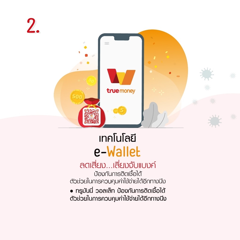 2.เทคโนโลยี e-Wallet ลดเสี่ยง…เลี่ยงจับแบงค์ ล่าสุดแถลงการณ์องค์การอนามัยโลก ยังได้เตือนว่า เชื้อไวรัส COVID-19 อาจจะติดอยู่บนหน้าธนบัตรหลายวัน ดังนั้น การชำระเงินผ่านแอปทางการเงิน แทนการสัมผัสเงินสด ช่วยลดความเสี่ยงได้ แค่ใช้ ทรูมันนี่ วอลเล็ท เพียงเท่านี้ ก็จะช่วยป้องกันการติดเชื้อได้ และยังมีระบบการแจ้งเตือนที่สามารถเช็คได้ทันทีว่าใช้ไปเท่าไหร่ และเหลือยอดเท่าไหร่ และยังช่วยในการควบคุมค่าใช้จ่ายได้อีกทางนึง