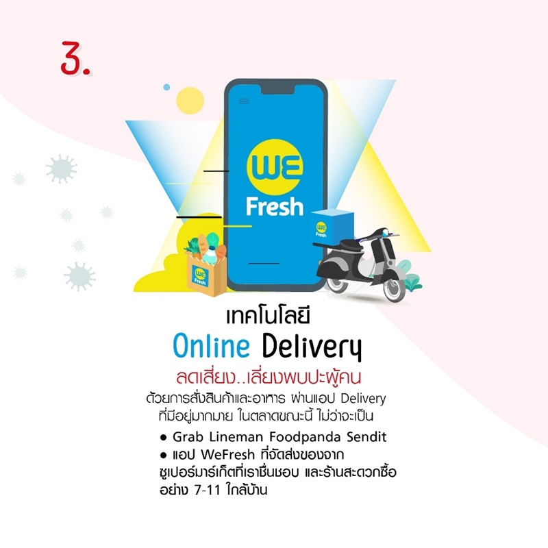 3.เทคโนโลยี Online Delivery ลดเสี่ยง..เลี่ยงพบปะผู้คน ด้วยการสั่งสินค้าและอาหาร ผ่านแอป Delivery ที่มีอยู่มากมายในตลาดขณะนี้ ไม่ว่าจะเป็น Grab Lineman Foodpanda Sendit จะเป็นอาหารจากร้านโปรด ร้านดังแค่ใหน ก็ไม่ต้องเสี่ยงไปเบียดเสียดผู้คน แถมสะดวกรวดเร็ว แป๊ปๆ พี่ๆคนขับก็ มากดกริ่ง ส่งของหน้าบ้านรวดเร็วทันใจไร้กังวล หรือจะเลือกสั่งวัตถุดิบมาทำเองแบบสด ๆ ใหม่ๆ ก็มีแอป WeFresh ที่จัดส่งของจากซูเปอร์มาร์เก็ตที่เราชื่นชอบ และร้านสะดวกซื้ออย่าง 7-11 ใกล้บ้านก็เป็นอีกหนึ่งช้อยส์ให้เลือกจับจ่ายสินค้าอุปโภค บริโภคที่เราใช้ในชีวิตประจำวัน