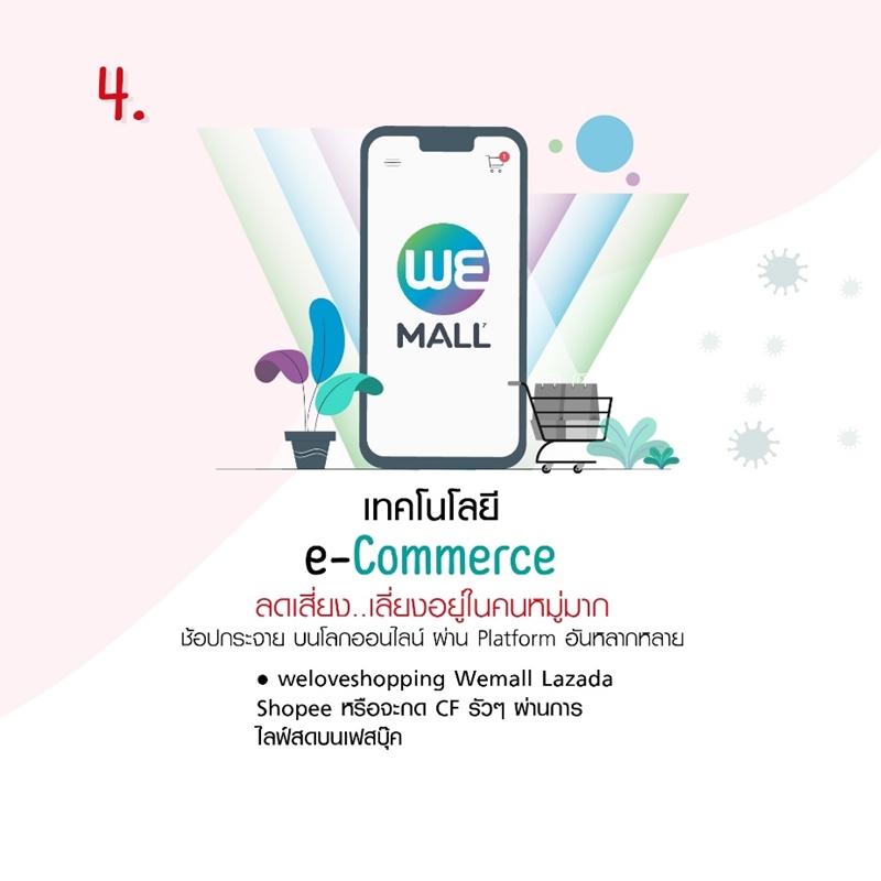 4.เทคโนโลยี e-Commerce ลดเสี่ยง..เลี่ยงอยู่ในคนหมู่มาก ช้อปกระจายไปกับร้านดัง จะแบรนด์ไทย แบรนด์นอก สุดฮิป อินเทรนด์ ที่มีให้เลือกสรรมากมายบนโลกออนไลน์ ผ่าน Platform อันหลากหลายไม่ว่าจะเป็น weloveshopping wemall Lazada Shopee หรือจะกด CF รัวๆ ผ่านการไลฟ์สดบนเฟสบุ๊ค ของบรรดาพ่อค้า แม่ค้า แค่นี้ก็ได้ช้อปแบบชิลๆ แบบปราศจากความกังวล