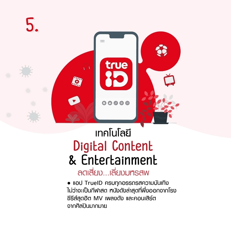 5.เทคโนโลยี Digital Content & Entertainment ลดเสี่ยง…เลี่ยงมหรสพ ในช่วงที่ทุกคนต้องเก็บตัวอยู่กับบ้านเป็นหลัก เพราะบรรดาอีเว้นต์ และ คอนเสิร์ต ต่างก็พากันยกเลิกกันเป็นแถว หรือโปรแกรมหนังโปรดก็เลื่อนฉาย และเพื่อคลายเหงา ไม่ให้ชีวิตขาดรสชาด แค่เปิดแอป TrueID ความบันเทิงครบทุกอรรถรสก็จะกลับมาสู่ชีวิต ไม่ว่าจะเป็นกีฬาสด หนังดังล่าสุดที่พึ่งออกจากโรง ซีรีส์สุดฮิต MV เพลงดัง และคอนเสิร์ตจากศิลปินมากมาย