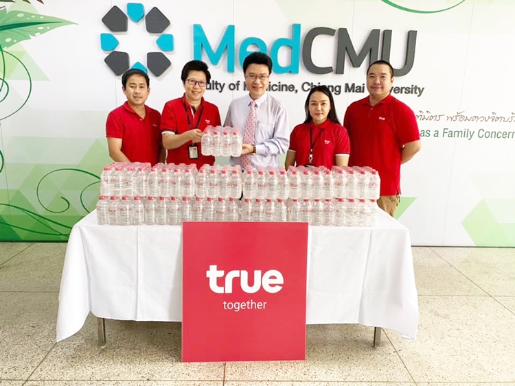 กลุ่มทรู โดย คุณจินดาภรณ์ มะโนวรรณา ผู้จัดการทั่วไปเขตภาคเหนือตอนบน พร้อมพนักงาน ส่งมอบน้ำดื่มจำนวน 1,000 ขวด ให้กับ รศ.นพ.ชัยวัฒน์ บำรุงกิจ ผู้อำนวยการโรงพยาบาลมหาราชนครเชียงใหม่ เพื่อให้บุคลากรทางการแพทย์ ได้มีน้ำดื่มสะอาดอย่างเพียงพอในสถานการณ์วิกฤต COVID-19