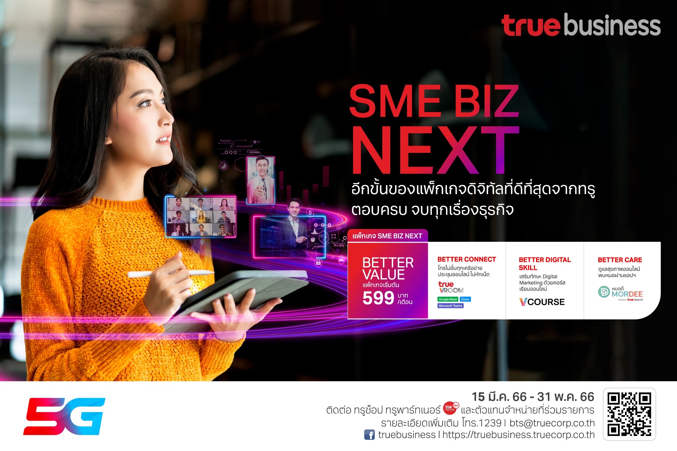 กรุงเทพฯ 15 มีนาคม 2566 – ทรูบิสิเนส ยกระดับความคุ้มค่าที่เหนือกว่า (Better Value) สำหรับลูกค้าธุรกิจ SME และ สตาร์ทอัพ เปิดตัว“SME BIZ NEXT” อีกขั้นของแพ็กเกจดิจิทัลที่ตอบโจทย์ทั้งเวิร์คสไตล์และไลฟ์สไตล์ ให้ธุรกิจเดินหน้าได้อย่างคล่องตัวไม่สะดุดครบจบทุกเรื่องในแพ็กเกจเดียว ได้ทั้งบริการสื่อสารที่มากกว่า (Better Connect) โทรฟรีได้ทุกเครือข่ายตลอด 24 ชั่วโมงและประชุมออนไลน์ไม่หักเน็ตนาน 12 เดือน เพิ่มทักษะดิจิทัลให้เหนือกว่า (Better Digital Skill) ด้วยคอร์สเรียนออนไลน์ จาก VCOURSE และการดูแลสุขภาพพนักงานที่ดีกว่า (Better Care) กับบริการให้คำปรึกษาด้านสุขภาพพบหมอออนไลน์ผ่านแอปพลิเคชัน หมอดี (MorDee) แพ็กเกจ“SME BIZ NEXT” ช่วย SME เพิ่มประสิทธิภาพในการทำงานและควบคุมค่าใช้จ่าย มีให้เลือก 3 แพ็กเกจตามขนาดของธุรกิจ เริ่มต้นเพียงเดือนละ 599 บาท ลูกค้าธุรกิจที่สนใจสมัครใช้บริการได้ตั้งแต่วันที่ 15 มีนาคม 2566 – 31 พฤษภาคม 2566