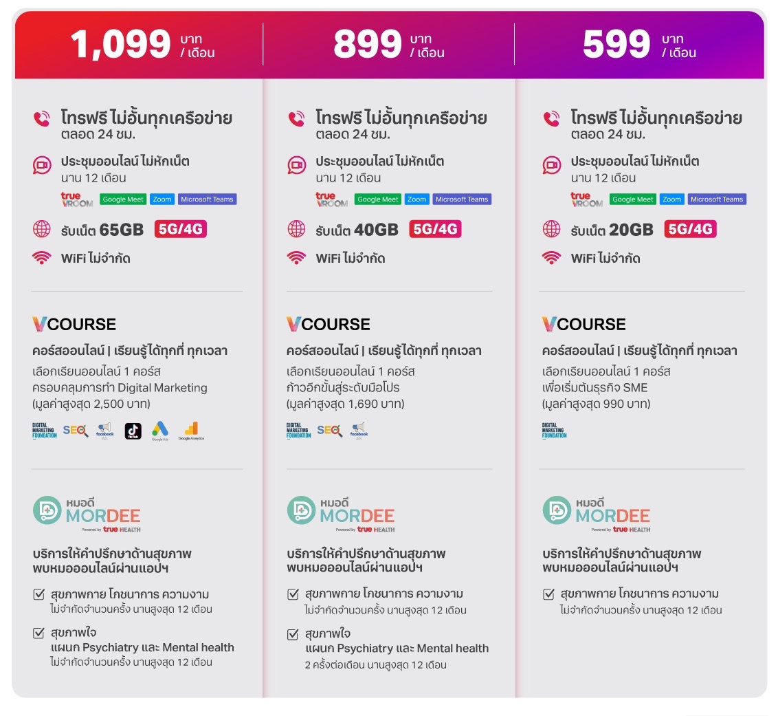 • Better Connect – โทรฟรีไม่อั้นทุกเครือข่าย และฟรีเน็ตสำหรับประชุมออนไลน์ผ่าน True VROOM, Google Meet, Zoom และ Microsoft Teams นาน 12 เดือน พร้อมรับเน็ตเพิ่มฟรี และ WiFi ไม่จำกัด