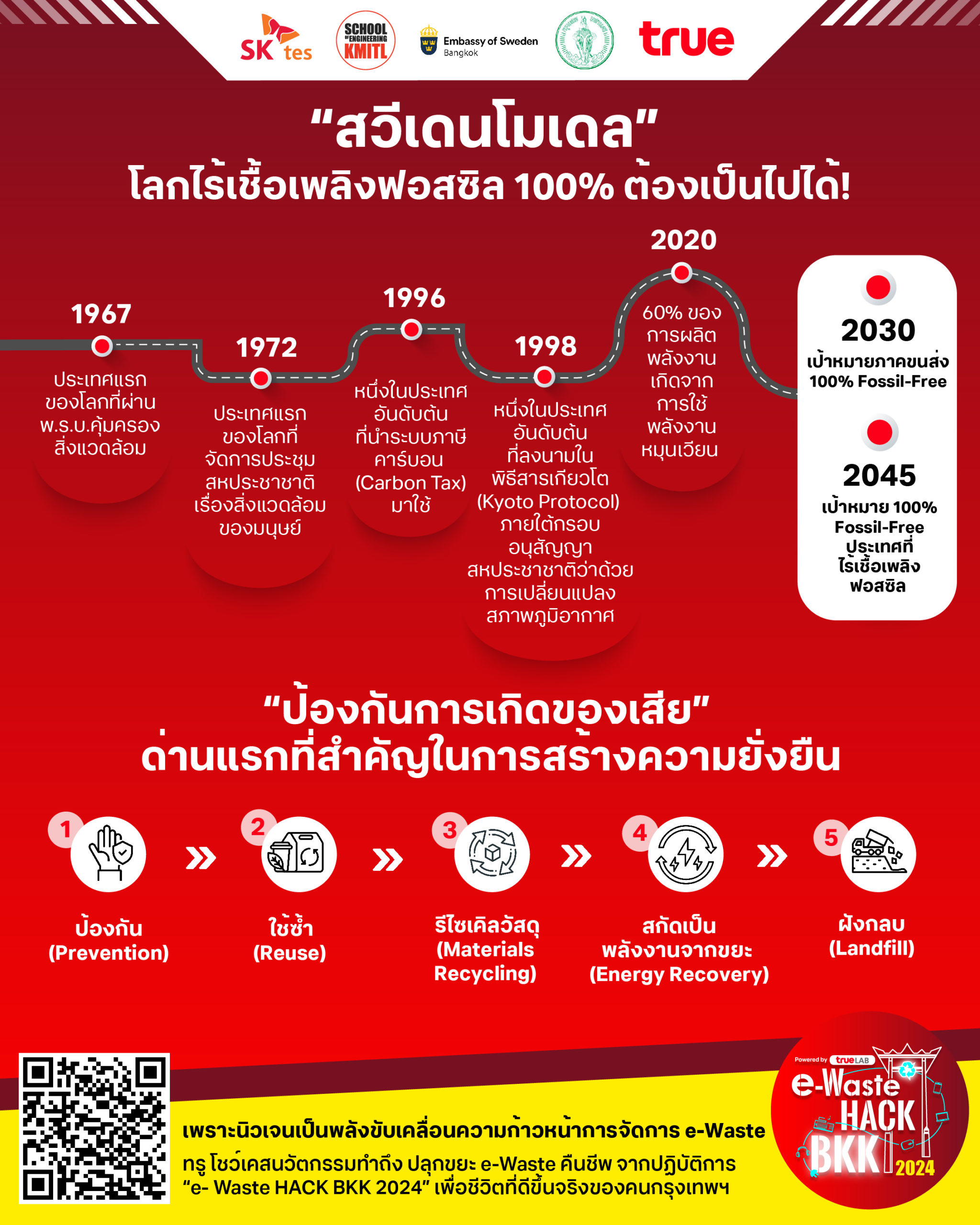 “กิจกรรมต่างๆ อย่าง e-Waste HACK BKK 2024 เป็นเวทีที่ยอดเยี่ยมสำหรับเยาวชนได้ใช้ความคิดสร้างสรรค์และทักษะทางเทคนิคในการพัฒนาโซลูชันที่สามารถนำไปทำจริงได้ เพื่อจัดการกับความท้าทายด้านขยะอิเล็กทรอนิกส์ในกรุงเทพฯ ซึ่งไม่ว่าจะเป็นการส่งเสริมการศึกษา ความร่วมมือ และนวัตกรรม สวีเดนสามารถร่วมมือกับประเทศไทย เพื่ออนาคตที่ยั่งยืน” เอกอัครราชทูตอันนา ฮัมมาร์เกรน กล่าวทิ้งท้าย