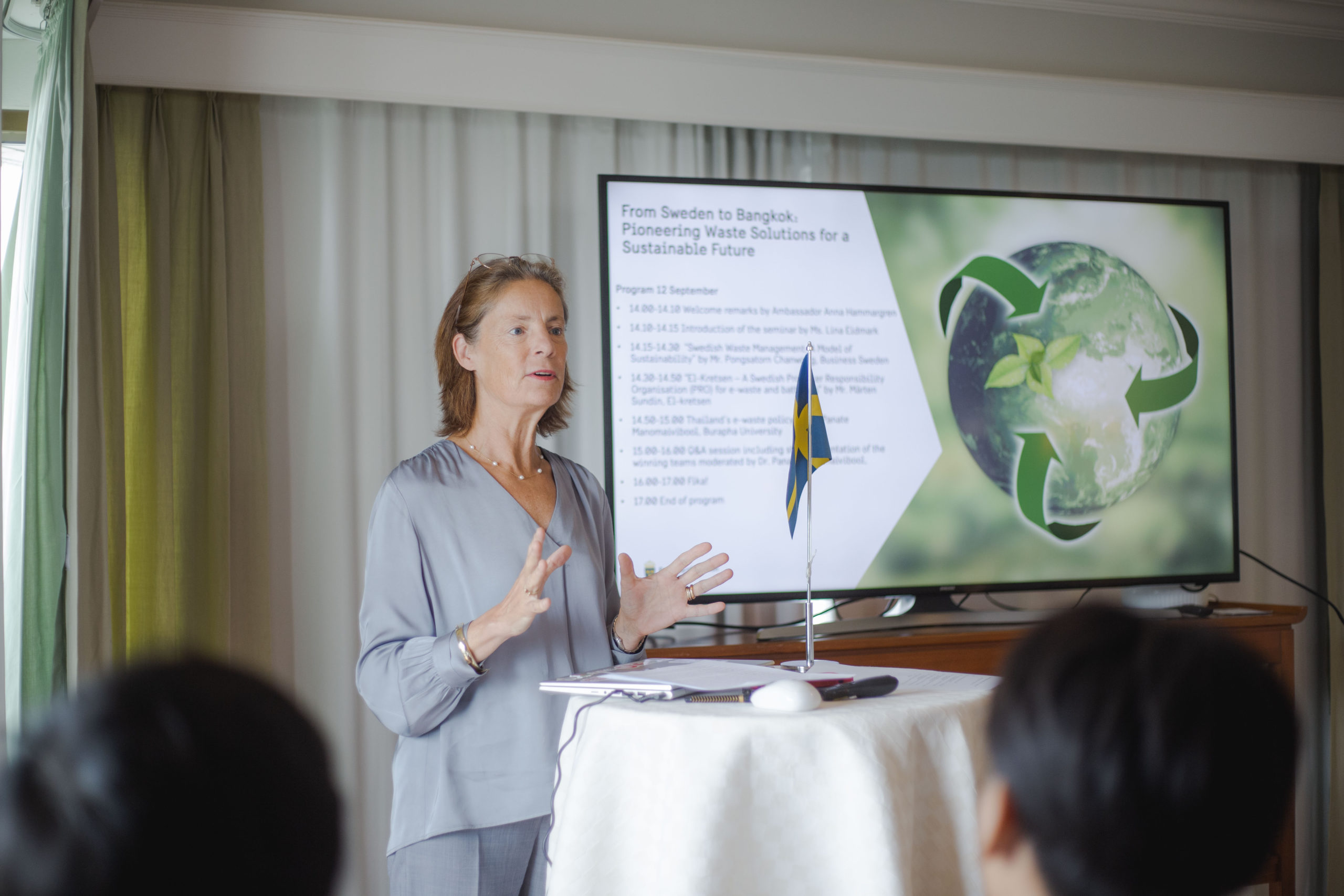 เอกอัครราชทูตอันนา ฮัมมาร์เกรน แบ่งปันมุมมองในการปรับปรุงกระบวนการรีไซเคิลขยะอิเล็กทรอนิกส์ สำหรับประเทศไทย อย่างน่าสนใจว่า “การใช้นโยบายที่คล้ายกัน อย่าง EPR (Extended Producer Responsibility) จะเป็นประโยชน์อย่างมาก ด้วยการใช้กฎระเบียบที่ให้ผู้ประกอบการรับผิดชอบดูแลอุปกรณ์อิเล็กทรอนิกส์ที่หมดอายุการใช้งาน ประเทศไทยสามารถพัฒนาระบบที่มีโครงสร้างและมีประสิทธิภาพมากขึ้นในการจัดการขยะ e-Waste การสร้างระบบการเก็บกลับและโครงสร้างพื้นฐานการรีไซเคิลที่ดีขึ้นจะช่วยให้มั่นใจได้ว่า วัสดุที่มีคุณค่าจะได้รับการกู้คืน และสารที่เป็นอันตรายจะถูกกำจัดอย่างปลอดภัย”