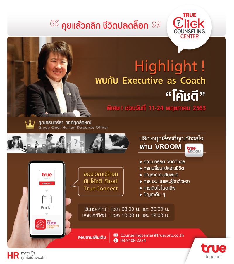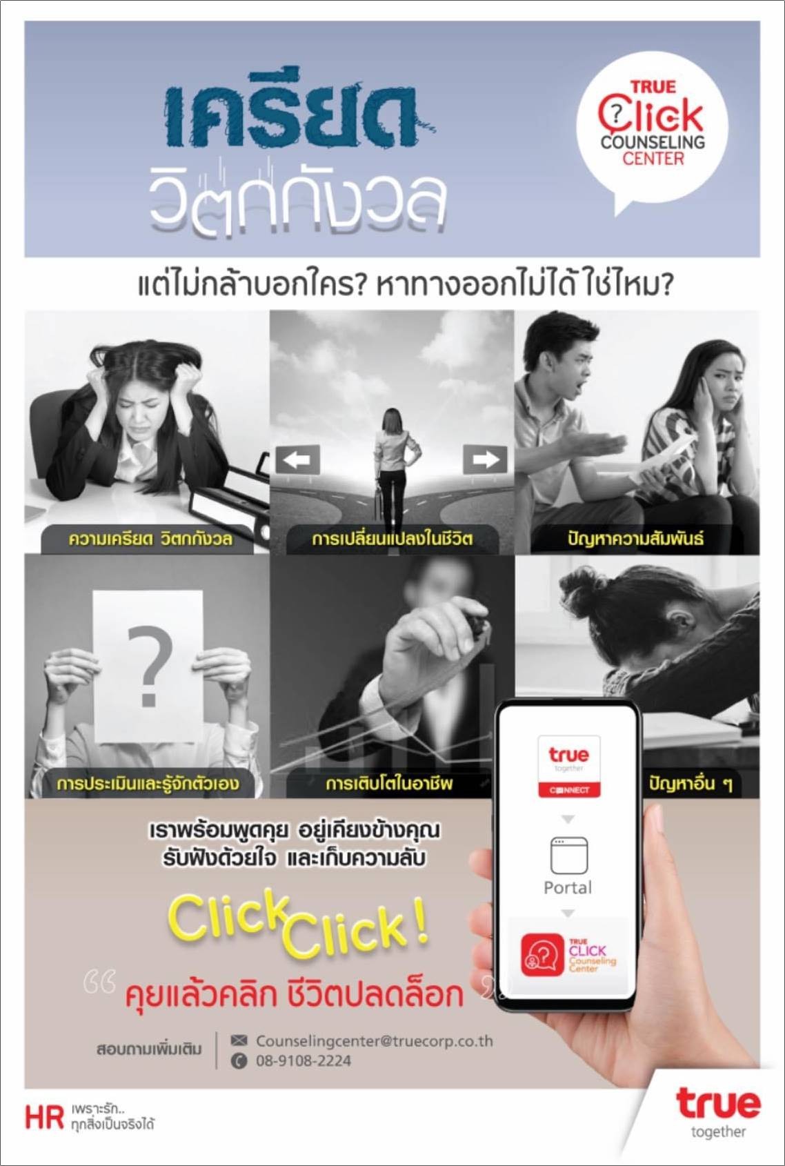 สายงานทรัพยากรบุคคล กลุ่มทรู จึงเปิดศูนย์ให้คำปรึกษาแบบออนไลน์ TRUECLICK COUNSELING CENTER ให้พูดคุยแบบตัวต่อตัวกับโค้ชมืออาชีพ ผ่านเทคโนโลยี True VROOM เพื่อที่ชาวทรูจะได้มีพลังกาย พลังใจ สามารถผ่านพ้นวิกฤตต่างๆ นี้ไปได้อย่างราบรื่น มีคุณภาพชีวิตที่ดีและพร้อมส่งต่อสิ่งดี ๆ ไปยังผู้อื่น