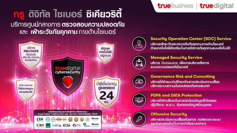เสริมเกราะองค์กรปลอดภัยในโลกไซเบอร์…ทรู ดิจิทัล เปิดตัวโซลูชันใหม่ “ทรู ดิจิทัล ไซเบอร์ ซิเคียวริตี้” บริการเฝ้าระวังภัยคุกคามและบริหารจัดการความปลอดภัยไซเบอร์ครบวงจร ให้คำปรึกษา ติดตั้ง บริหารจัดการระบบอุปกรณ์ความปลอดภัย และศูนย์เฝ้าระวังภัยคุกคามทางด้านไซเบอร์ การันตีคุณภาพมาตรฐานสากลพร้อมรับมือทุกสถานการณ์ ทั้งป้องกัน เฝ้าระวัง หาสาเหตุ และแจ้งเตือน