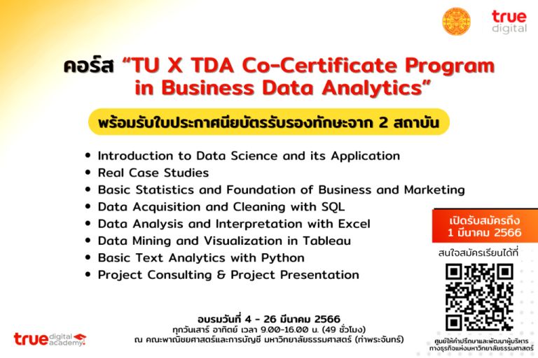 คอร์ส “TU x TDA Co-Certificate Program in Business Data Analytics” มีระยะเวลาเรียนรวม 49 ชั่วโมง เรียนทุกวันเสาร์-อาทิตย์ เวลา 09.00-16.00 น. ระหว่างวันที่ 4 – 26 มีนาคม 2566 ณ. คณะพาณิชยศาสตร์และการบัญชี มหาวิทยาลัยธรรมศาสตร์ (ท่าพระจันทร์) ผู้เข้าอบรมจะได้เรียนรู้หลักการ แนวคิดและทฤษฎี ตลอดจนเครื่องมือที่สำคัญในการวิเคราะห์ข้อมูลขนาดใหญ่เพื่อกำหนดกลยุทธ์ทางธุรกิจ สอนโดยผู้เชี่ยวชาญทั้งด้านวิชาการและเฉพาะด้านที่มากด้วยประสบการณ์การทำงานจริงในองค์กรชั้นนำ เรียนจบรับใบประกาศนียบัตรรับรองทักษะมหาวิทยาลัยธรรมศาสตร์ และ ทรู ดิจิทัล อคาเดมี โดยหลักสูตรครอบคลุมหัวข้อต่างๆ อาทิ