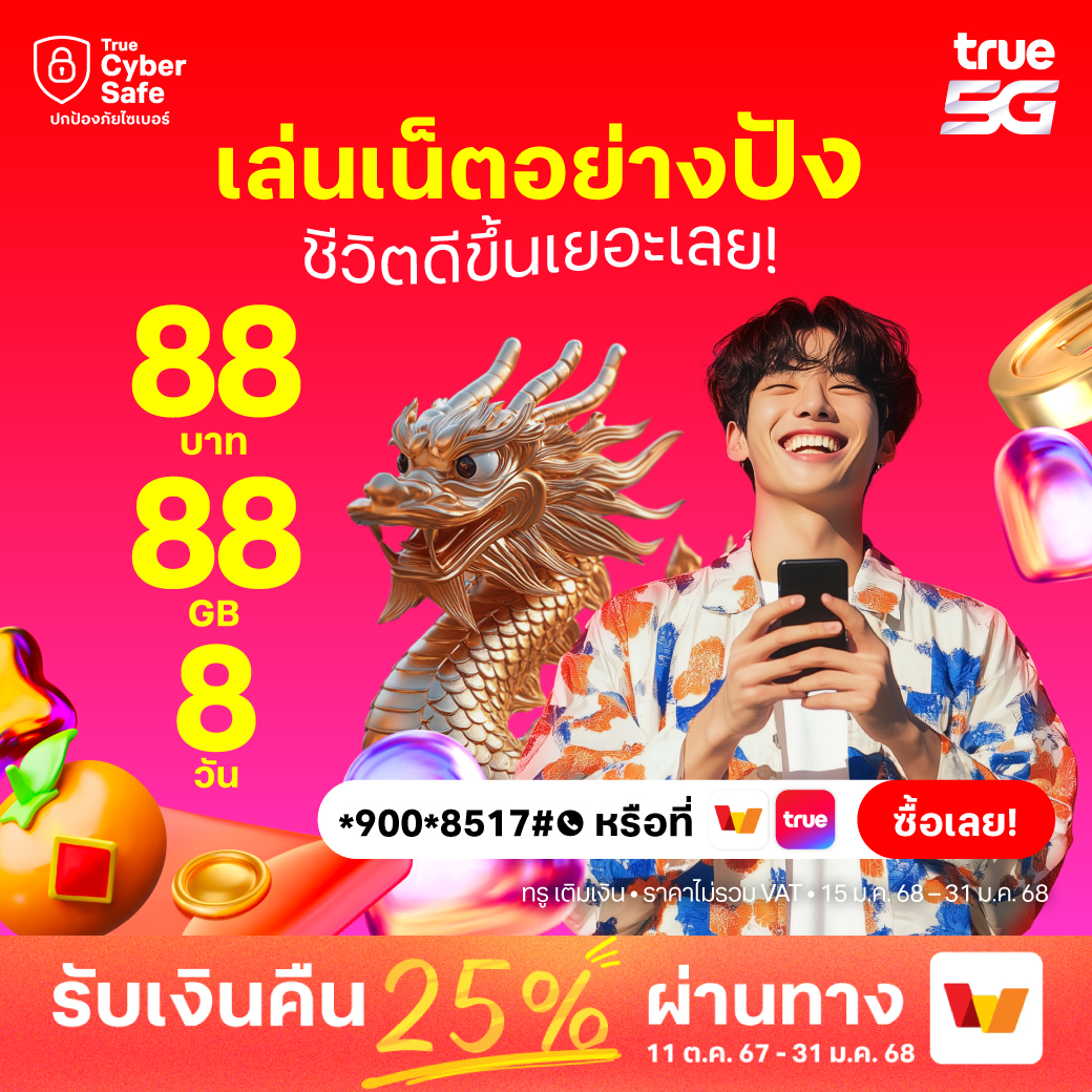 - ลูกค้าทรู ดีแทค เติมเงิน เฮงเต็มสปีดกับ เน็ตเต็มสปีด 88 GB 88 บาท ใช้ได้ 8 วัน ตั้งแต่ 15 – 31 ม.ค. 68 พร้อมรับเงินคืน 25% ผ่านทรูมันนี่แอป ฯ