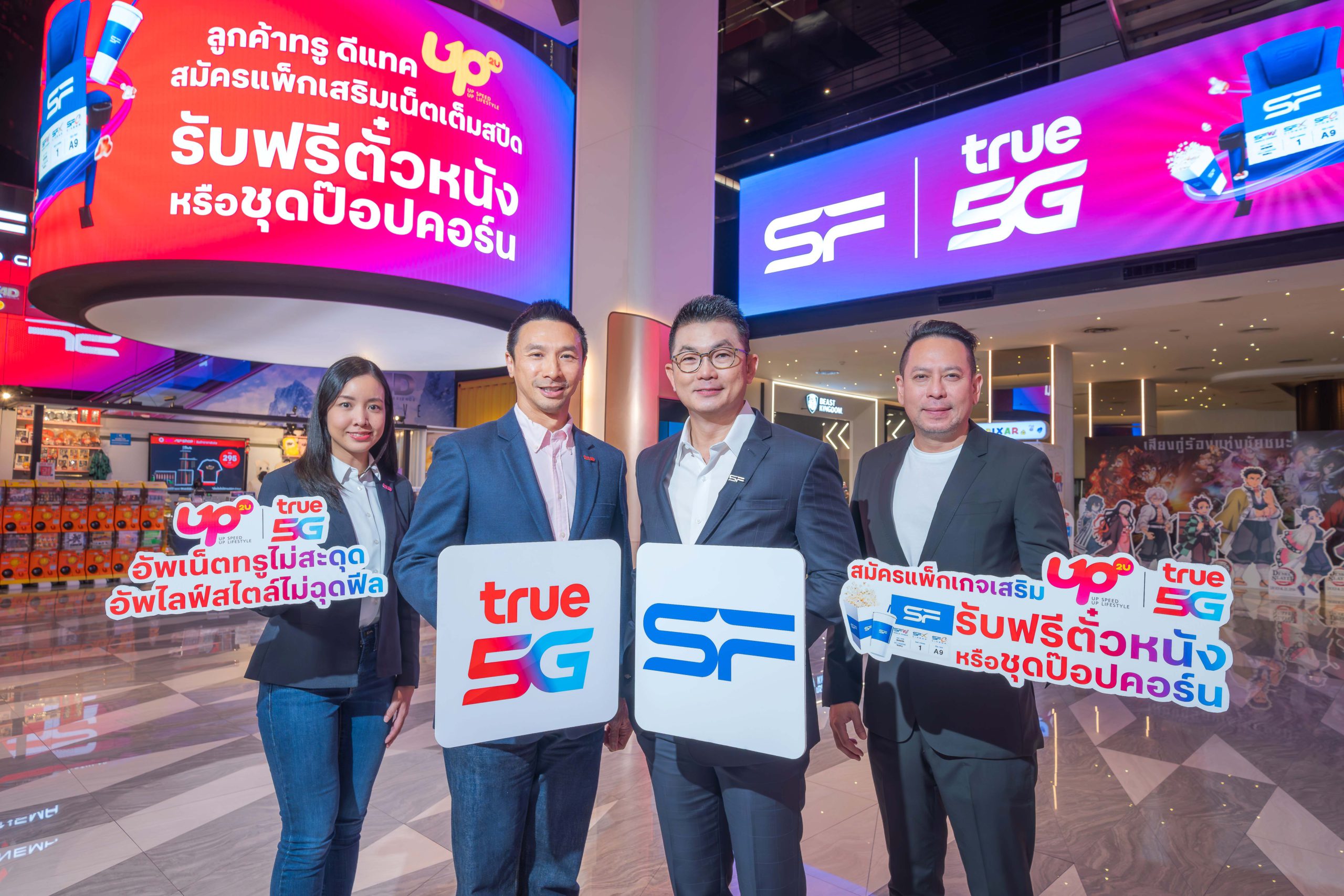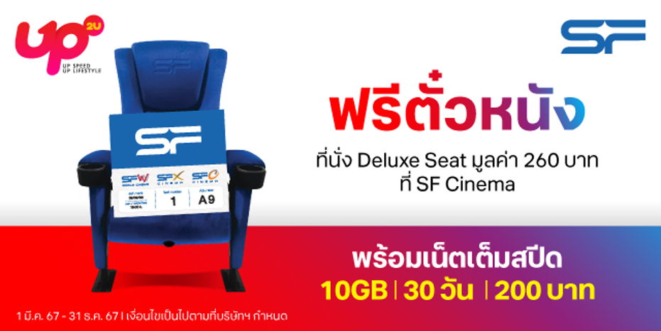 กรุงเทพฯ 18 มีนาคม 2567 – อัพทุกไลฟ์สไตล์… ทรู 5G โดย นายฐานพล มานะวุฒิเวช หัวหน้าคณะผู้บริหารด้านการตลาด บมจ.ทรู คอร์ปอเรชั่น ร่วมกับ โรงภาพยนตร์ในเครือ เอส เอฟ โดย นายสุวิทย์ ทองร่มโพธิ์ ประธานเจ้าหน้าที่บริหารสายงานการตลาด บริษัท เอส เอฟ คอร์ปอเรชั่น จำกัด (มหาชน) ส่งแคมเปญ “UP2U อัพเน็ตทรูไม่สะดุด อัพไลฟ์สไตล์ไม่ฉุดฟีล” มอบสิทธิพิเศษสำหรับลูกค้า ทรูและดีแทค ทั้งแบบเติมเงินและแบบรายเดือน จัดเต็มประสบการณ์ความบันเทิงสุดคุ้มตลอดปี 2567 รับฟรีบัตรชมภาพยนตร์ที่นั่ง Deluxe 1 ที่นั่ง หรือ Combo Set ไซซ์ M จำนวน 1 ชุด เพียงสมัครแพ็กเกจUP2U ที่ร่วมรายการ ผ่าน 3 ช่องทาง ได้แก่ 1. สมัครด้วยตนเองผ่านการกด USSD* เลือกแพ็กเกจตามที่ต้องการ 2. สมัครผ่านแอปพลิเคชัน True iService, True Money, TrueID, dtac app และ 3. ทรูช็อป และดีแทคช้อป ทุกสาขาและตัวแทนจำหน่ายที่ร่วมรายการ ตั้งแต่วันนี้ถึง 31 ธันวาคม 2567
