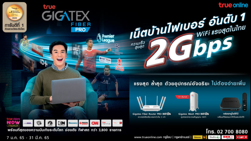 คุณธนภูมิ ภาคย์วิศาล ผู้อำนวยการและหัวหน้าสายงานการพาณิชย์ทรูออนไลน์ บมจ. ทรู คอร์ปอเรชั่น กล่าวว่า “ก้าวสู่ศักราชใหม่ 2565 นี้ ทรูออนไลน์ ยังคงครองความเป็นผู้นำเน็ตบ้านไฟเบอร์ อันดับ 1 ของไทย ที่ได้รับรางวัลคุณภาพระดับโลกจาก nPerf พร้อมยกระดับประสบการณ์ชีวิตดิจิทัลอย่างเต็มรูปแบบ ทั้งกลุ่มลูกค้าองค์กร ที่ได้เปิดให้บริการระดับ 10 Gbps จนเป็นที่ยอมรับมาอย่างยาวนานแล้วนั้น และในปีนี้ ทรูออนไลน์ พร้อมเดินหน้าส่งมอบความเร็ว แรง แก่กลุ่มลูกค้าบุคคล จึงประเดิมเปิดแพ็กเกจ “ทรู กิกะเทค ไฟเบอร์ 2 Gbps” ที่ปล่อยสัญญาณ WiFi สปีดแรงสุดในประเทศไทย เลือกสรรได้ตามไลฟ์สไตล์การใช้งานของแต่ละครอบครัว ในราคาเริ่มต้นเดือนละ 1,299 บาท มอบความคุ้มค่า ฟรี ครบเซ็ท กับ 3 อุปกรณ์อัจฉริยะ ทั้ง True Gigatex Fiber Router PRO WiFi 6 Router อัจฉริยะ เล่นเน็ต WiFi แรงขึ้นกว่าเดิมถึง 3 เท่า True Gigatex Mesh PRO WiFi 6 รุ่น Tri Band อุปกรณ์เสริมกระจายสัญญาณ WiFi ให้แรงครอบคลุมทั่วบ้าน ใช้งาน WiFi 6 ได้อย่างเต็มประสิทธิภาพ และกล่อง ทรูไอดีทีวี ครบ สุด คอนเทนต์ระดับโลก ผ่านแพ็กเกจทรู ไอดี พลัส และทรูวิชั่นส์ นาว ชมทรูพรีเมียร์ลีก สดทุกแมตช์ตลอดฤดูกาล 2021-2022 พร้อมซิมทรูมูฟ เอช เล่นเน็ตเต็มสปีด 15 GB โทรฟรี 60 นาที พิเศษยิ่งขึ้น สำหรับลูกค้าทรูแบล็ค การ์ด รับเพิ่ม True Gigatex Mesh PRO WiFi 6 อีกหนึ่งตัว และสิทธิ์อัปเกรดความบันเทิงจากแพ็กเกจทรูวิชั่นส์ นาว สแตนดาร์ด เป็น แพ็กเกจทรูวิชั่นส์ นาว พรีเมียม ชมคอนเทนต์พิเศษจุใจ อัดแน่นครบรสทุกความบันเทิง รวม 43 ช่อง กว่า 3,800 รายการ อีกด้วย”