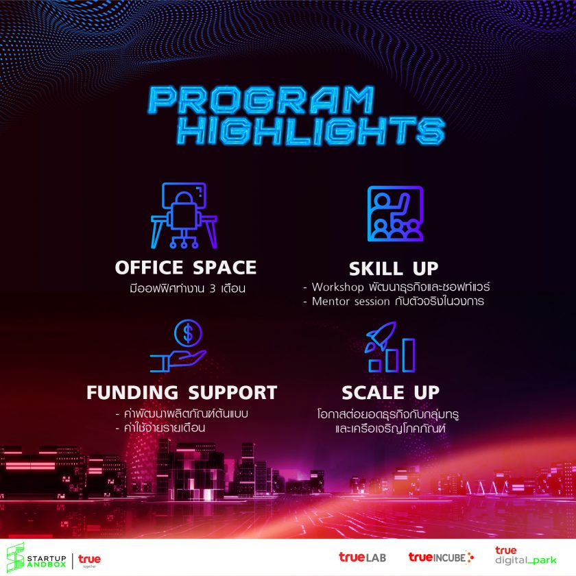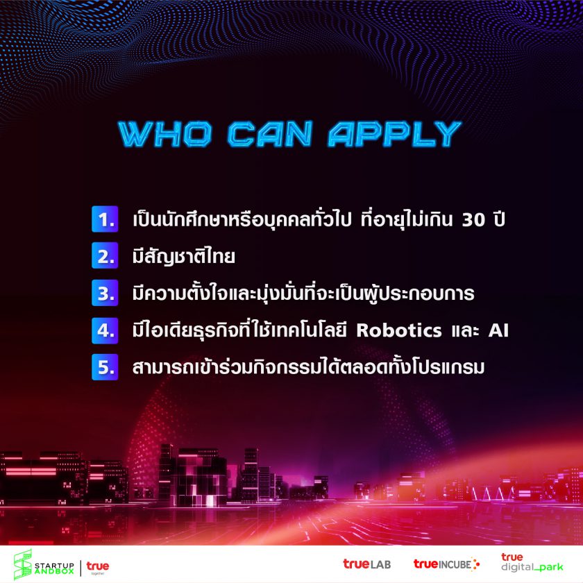 ขอเชิญชวนนักศึกษา และผู้ประกอบการรุ่นใหม่ ร่วมชิงรางวัลมูลค่ารวม 1,500,000 บาท กับโปรแกรม True Lab Startup Sandbox สานฝันสู่การเป็น Startup Founder รวมทีม 3-5 คน เพื่อร่วมค้นหาสุดยอดนวัตกรรมการใช้เทคโนโลยี Robotics & Artificial Intelligence (AI) รับการสนับสนุนจากกลุ่มทรู เพื่อนำแนวคิดสร้างสรรค์มาต่อยอดทางธุรกิจ