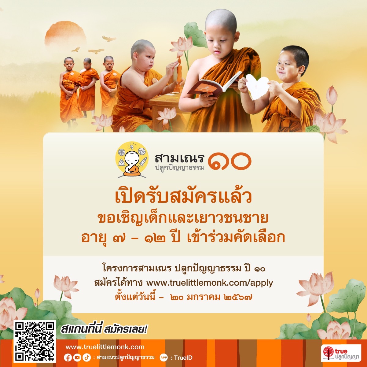 กรุงเทพฯ 21 พฤศจิกายน 2566 – เตรียมพร้อมสู่ทศวรรษ บนถนนสายธรรมอย่างงดงามอีกครั้ง กับโครงการสามเณร ปลูกปัญญาธรรม ปีที่ 10…เครือเจริญโภคภัณฑ์ และทรู คอร์ปอเรชั่น เชิญชวนเด็กและเยาวชนชาย อายุ 7-12 ปี ทั้ง 77 จังหวัด ทั่วประเทศ ใช้เวลาช่วงปิดเทอมอย่างมีคุณค่า เข้าร่วมสมัครในโครงการสามเณร ปลูกปัญญาธรรม ปี 10 ที่พร้อมสัญจรมุ่งสู่ประตูเมืองของภาคอีสาน ด้วยการส่งประวัติ แนะนำตัว บอกเล่าเรื่องราวที่น่าสนใจของตนเอง พร้อมวิดีโอหรือภาพถ่าย และเรียงความเรื่อง “เหตุผลที่อยากบรรพชากับโครงการสามเณรปลูกปัญญาธรรมปี 10” ตั้งแต่วันนี้ – 20มกราคม 2567 ทาง www.truelittlemonk.com/apply เพื่อศึกษา และอบรมหลักธรรมคำสอนทางพระพุทธศาสนา โดยน้องๆ ที่ได้รับการคัดเลือก จะได้เข้าบรรพชาเป็นสามเณรปลูกปัญญาธรรม ในช่วงปิดภาคฤดูร้อน ณ สถานปฏิบัติธรรมธวีธรรม อ.ปากช่อง จ.นครราชสีมา เป็นระยะเวลา 1 เดือน ระหว่างวันที่ 19 เมษายน – 19 พฤษภาคม 2567 โดยไม่เสียค่าใช้จ่ายใดๆ ทั้งสิ้น