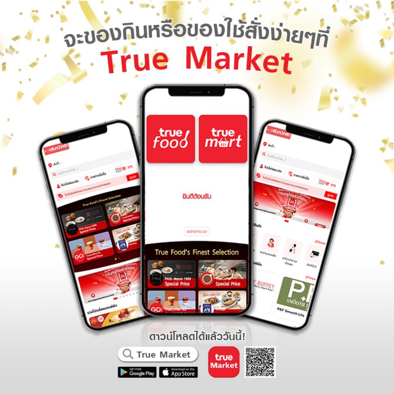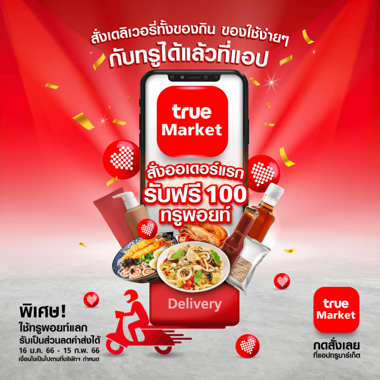 สำหรับ True Market เป็นแอปพลิเคชันบริการเดลิเวอรี่ที่พร้อมเติมเต็มไลฟ์สไตล์ให้กับลูกค้ายุคดิจิทัลได้อย่างหลากหลาย สะดวก ครบครันมากยิ่งขึ้น และพิเศษสำหรับลูกค้าใช้แอป True Market สั่งเดลิเวอรี่ออเดอร์แรกไม่ว่าจะเป็น True Food สั่งอาหาร หรือ True Mart สั่งสินค้าอุปโภคบริโภคและของใช้อื่นๆ รับฟรี! ทันที 100 ทรูพอยท์ ตั้งแต่วันนี้-15 ก.พ.66 พร้อมรับสิทธิพิเศษดีๆ มากมาย ทั้งใช้ทรูพอยท์แลกเป็นส่วนลด,ดีลเด็ด ดีลดังลดเพียบ