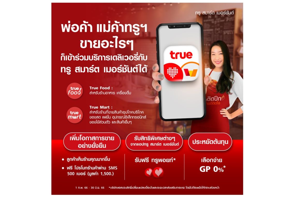 เริ่มก่อน ขายก่อน กำไรพุ่ง…ทรู สมาร์ต เมอร์ชันต์ พัฒนาฟีเจอร์ใหม่อย่างต่อเนื่อง ช่วยพ่อค้าแม่ค้า เพิ่มโอกาส สร้างยอดขาย ขยายแพลตฟอร์มบริการเดลิเวอรี่ ทั้งร้านอาหารและร้านโชห่วย สมัครวันนี้ ฟรี! ค่าธรรมเนียม ไม่เก็บ GP* วันนี้ – 30 มิ.ย.66
