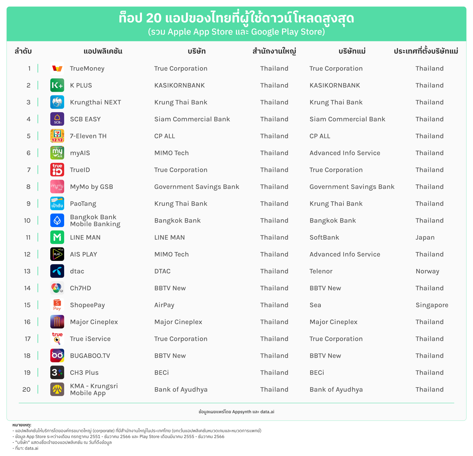 แอ๊พซินท์ (Appsynth) หนึ่งในที่ปรึกษาด้านดิจิทัลรายใหญ่ที่สุดในภูมิภาคและผู้เชี่ยวชาญด้านแอปบนสมาร์ตโฟนชั้นนำของไทย ได้ร่วมกับ data.ai แพลตฟอร์มวิเคราะห์ข้อมูลมือถือ เปิดเผยผลการจัดอันดับข้อมูลท็อป 20 แอปพลิเคชันขององค์กรไทยที่มีการดาวน์โหลดสูงสุด นับตั้งแต่มีการเปิดตัว App Store และ Play Store สถิติท็อปดาวน์โหลดจาก App Store เป็นข้อมูลระหว่างเดือนกรกฎาคม 2551 – ธันวาคม 2566 ส่วน Play Store เป็นข้อมูลช่วงเดือนมีนาคม 2555 – ธันวาคม 2566 จากข้อมูลพบว่า ท็อป 20 แอปพลิเคชัน กลุ่มธุรกิจในเครือซีพี ติดอันดับท็อปถึง 4 แอป ได้แก่ TrueMoney 7-Eleven TrueID และ True iService
