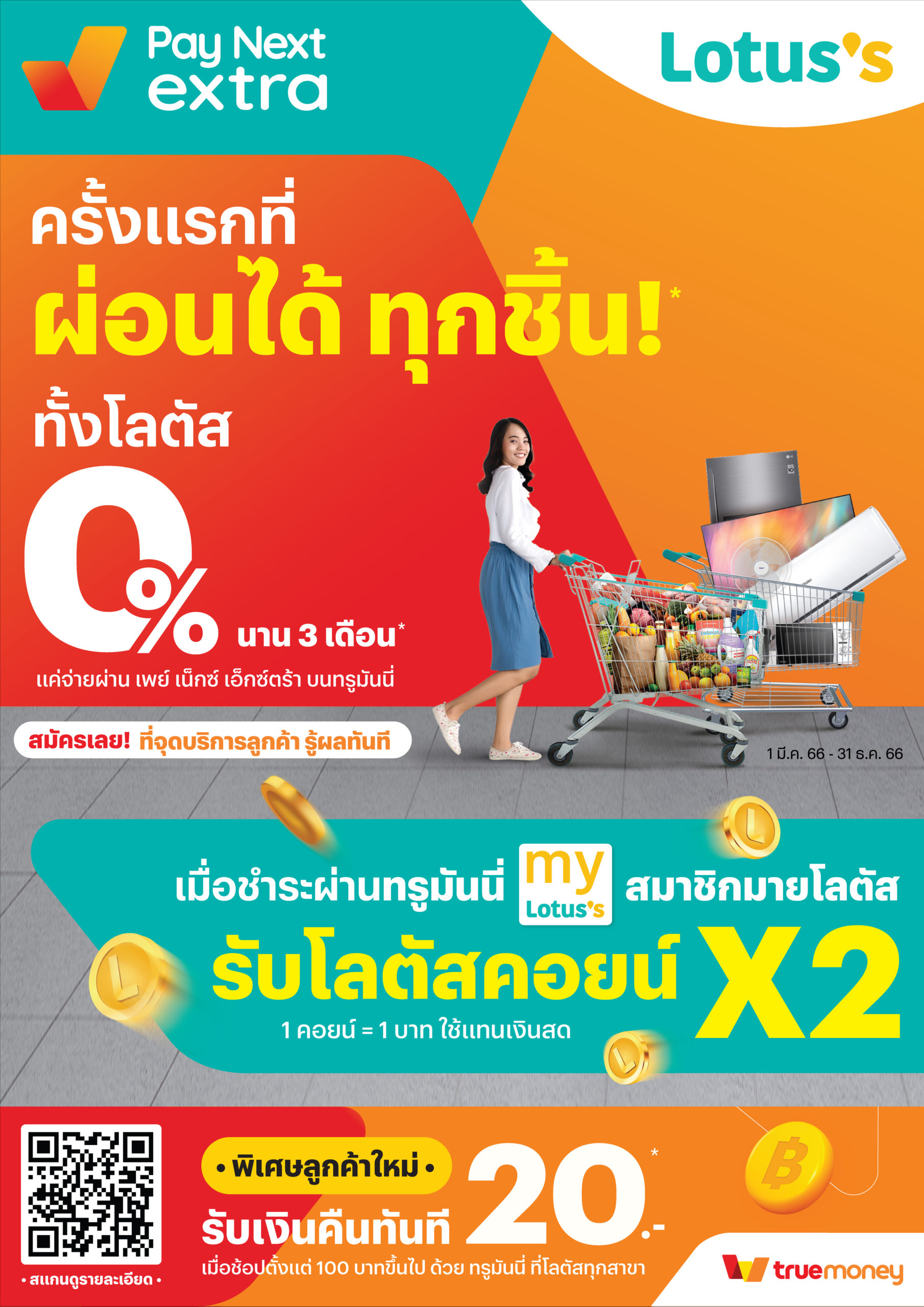โปรโมชั่นคอยน์ 2 เท่า พิเศษ ทุกครั้งที่จ่ายด้วยทรูมันนี่ สมาชิกมายโลตัสรับเพิ่มมายโลตัสคอยน์ 2 เท่า ใช้แทนเงินสดจ่ายแคชเชียร์ได้เลย 1 คอยน์เท่ากับ 1 บาท
