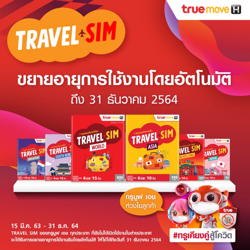 เนื่องจากสถานการณ์การเเพร่ระบาดของไวรัสโควิด-19 (COVID-19) ในขณะนี้ ซึ่งส่งผลกระทบต่อการเดินทางไปต่างประเทศ ทรูมูฟ เอช พร้อมขยายเวลาการใช้งาน TRAVEL SIM ของทรูมูฟ เอช ทุกประเภท ถึง 31 ธันวาคม 2564 ได้แก่ ซิมท่องเที่ยวเอเชีย TRAVEL SIM ASIA ซิมท่องเที่ยวทั่วโลก TRAVEL SIM WORLD ซิมท่องเที่ยวจีน ฮ่องกง ไต้หวัน มาเก๊า TRAVEL SIM GREATER CHINA ซิมท่องเที่ยวญี่ปุ่น TRAVEL SIM JAPAN ซิมท่องเที่ยวเกาหลีใต้ TRAVEL SIM SOUTH KOREA ซิมท่องเที่ยวสิงคโปร์ TRAVEL SIM SINGAPORE ที่ซื้อจากทุกช่องทาง และที่ยังไม่ได้เปิดใช้งานในต่างประเทศ จะได้รับการขยายเวลาการใช้งานซิมโดยอัตโนมัติ สอบถามรายละเอียดเพิ่มเติมได้ที่ทรูคอลล์เซ็นเตอร์1242 หรือ https://truemoveh.truecorp.co.th/international_service/travelling_abroad/travelsim