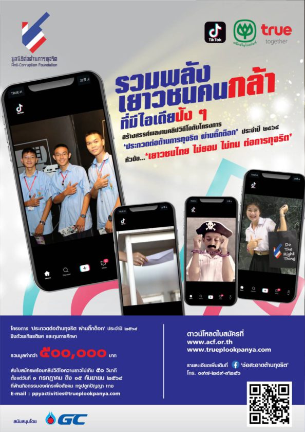 มูลนิธิต่อต้านการทุจริต เครือเจริญโภคภัณฑ์ กลุ่มทรู และติ๊กต็อก ด้วยการสนับสนุนของ พีทีที โกลบอล เคมิคอล ขอเชิญน้อง ๆ นักเรียนในระดับมัธยมศึกษา และระดับประกาศนียบัตรวิชาชีพ (ปวช.) ทั่วประเทศ ส่งผลงานคลิปวิดีโอรณรงค์ต่อต้านการทุจริต ความยาวไม่เกิน ๕๐ วินาที เข้าร่วมประกวดได้ตั้งแต่วันนี้ – ๑๕ กันยายน ๒๕๖๔ ทาง E-Mail : [email protected] เท่านั้น‼️