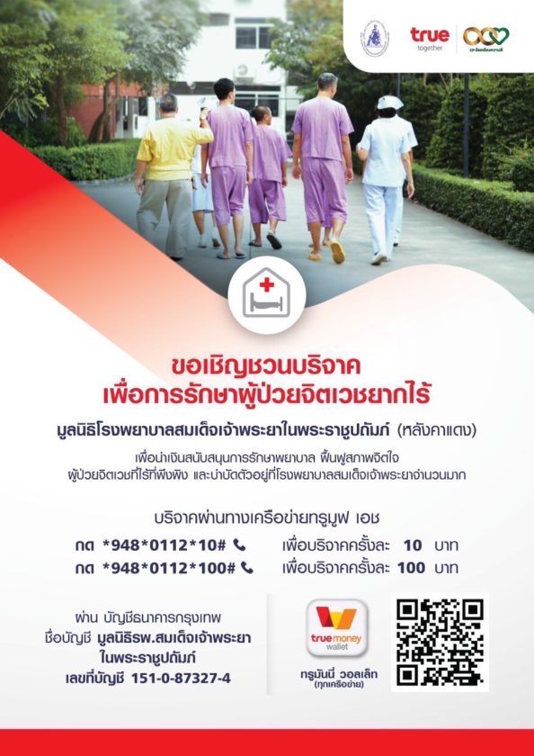 ขอบคุณลูกค้าทรู ร่วมบริจาคเงินช่วยเหลือผู้ป่วยจิตเวชยากไร้ผ่านมูลนิธิโรงพยาบาลสมเด็จเจ้าพระยาฯ กลุ่มทรูเป็นตัวแทนส่งมอบ พร้อมผลิตสื่อประชาสัมพันธ์รับบริจาคผ่าน QR code ให้รพ.สมเด็จเจ้าพระยา ตอกย้ำความเป็นผู้นำด้าน cashless society ที่แท้ทรู